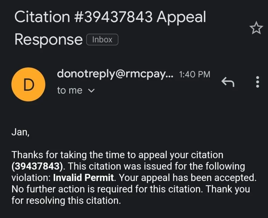 RE: Complaint ID #***Upon researching Ms***’s complaint, I found that no appeal was submitted to our company in regards to this citationI’ve attached a copy of the citation history to show that it was in fact paid the same day it was issued via our online payment siteThis is the same