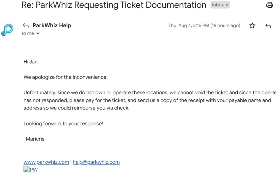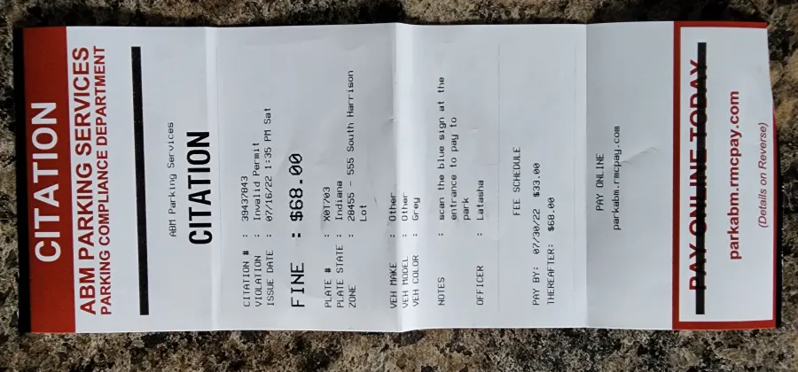 site through which patrons may submit an appealMs*** claims that the site “kept freezing”, however, she was able to successfully submit paymentThis negates her claim that there was nowhere to contest the ticketAdditionally, this website address is found the reverse side of the violation along with a mailing address and contact phone number, which Ms*** falsely state was not providedI’ve included attachments along with this e-mail containing a copy of the citation history, a copy of the reverse of our standard violation and a screen shot of the web site which clearly details the options for payment or appealing a violation.However, had Ms*** appealed, the citation would have been upheld as validIt is posted on all of our entrance signs and is printed on the receipts that there are no In-and-Out PrivilegesAlso, it is also printed on the receipts that all receipts are non-transferableAttached is a copy of one of our payment receiptsPlease note that this is only an example, and is not the actual receipt belonging to Ms***Additionally, Ms*** stated in her own words that she accepted another patron’s receipt and did not make any parking paymentFor this reason, the fines stand as valid and no refund of paid fines will be made.Thank you for your consideration,Parking Facilities ManagerABM Parking Services