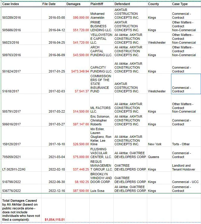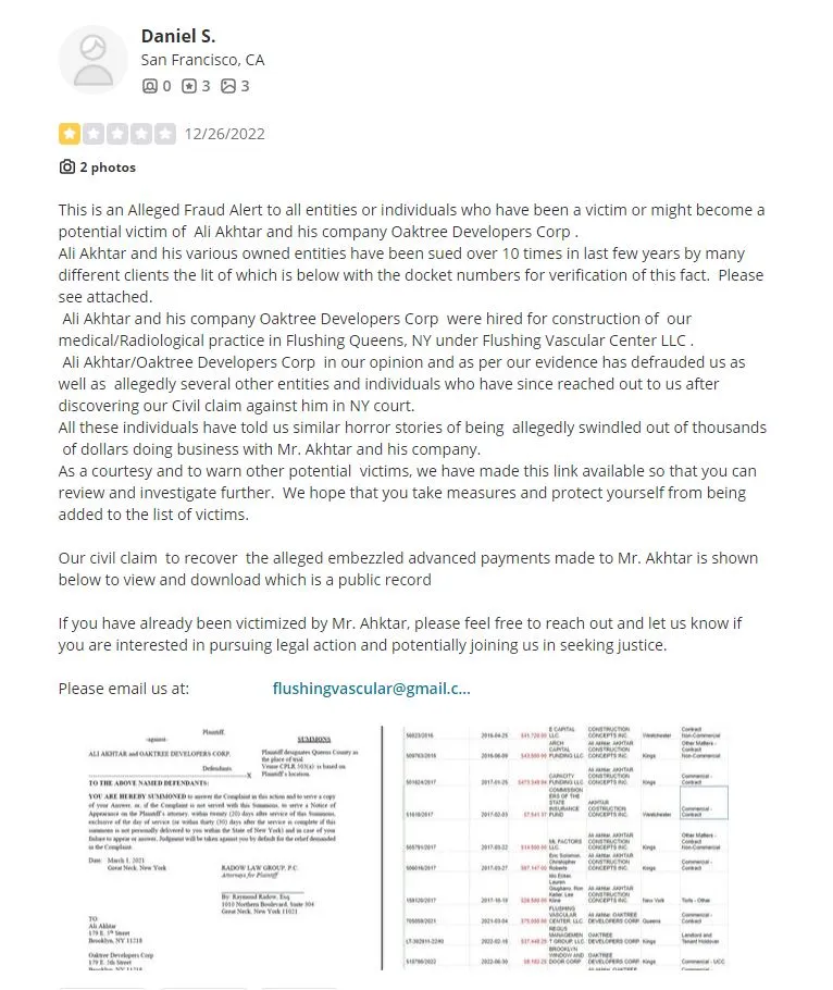 Ali Akhtar/Oaktree Developers Corp in our opinion and as per our evidence has defrauded us as well as allegedly several other entities and individuals who have since reached out to us after discovering our Civil claim against him in NY court.