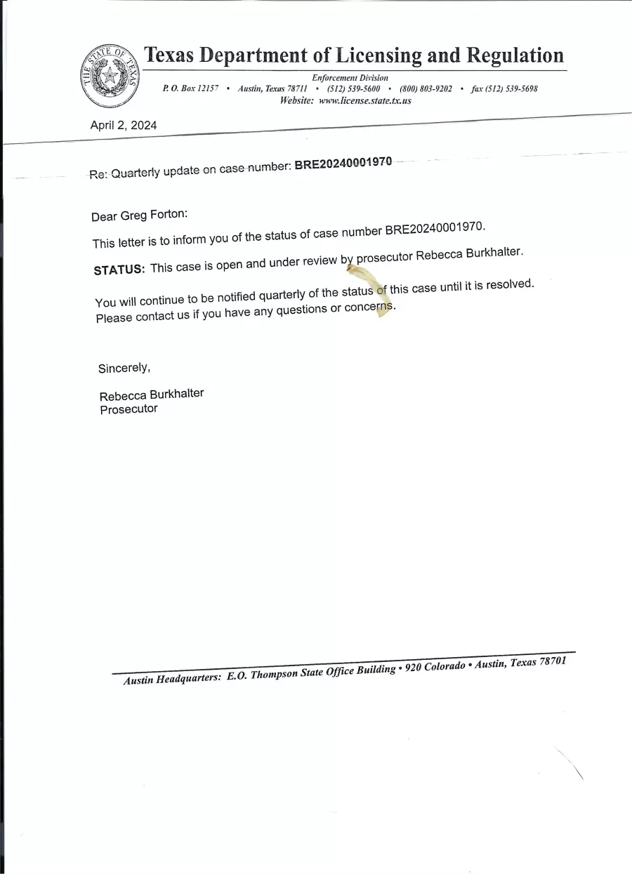 The Texas Department of Licensing and Regulations has sent my complaint to Rebecca Burkhalter, Prosecutor for review.