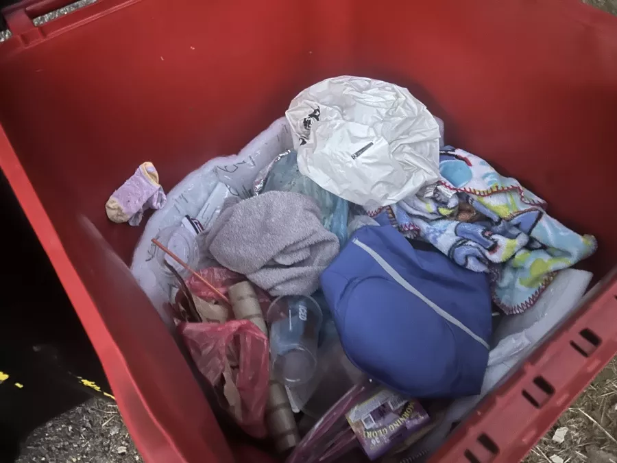 It appeared that the trash can may have been ran over...and lid was missing ...possibly put in trash truck for disposal.