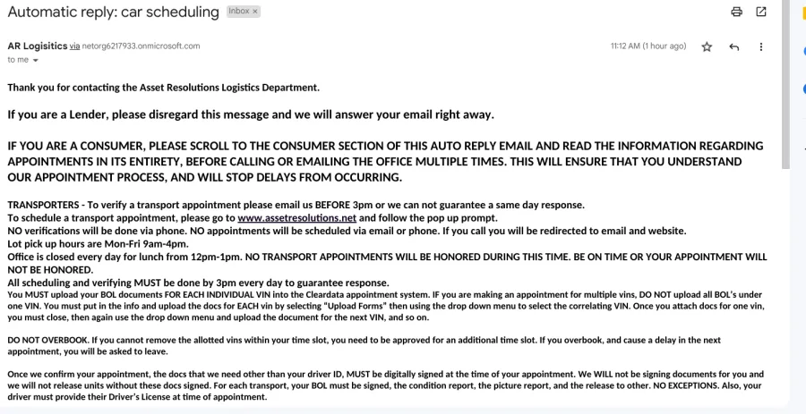 This company is horrible. They are very rude. They take your car and keep it for days stating it is because the appointment are booked for pick up for up to about 7 days. The main thing the owner always say is that they work for the finance company. However when we talk to the finance companies. If that is the case, they should only deal with the fianance company and the finance company should be responsible for making sure our cars are returned to the consumer in a safe and sufficient time. I had my encounter with this company almost a year ago. However I can see that people are still complaining about the horrible business practices of this company, The owner is very rude when you talk to her on the phone or through email. They have had numerous reviews about this company on google but Im sure they were able to have them removed. As much as possible I will leave a review because it is added stress that this company add to the life of an everyday consumer.