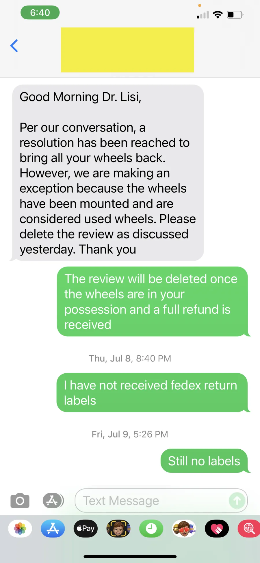 the wheels cannot be returned for refund, nor exchanged unless I pay shipping charges approx.. $600. And subject to 30% restocking fee. This conversation went on for a day or so, then finally