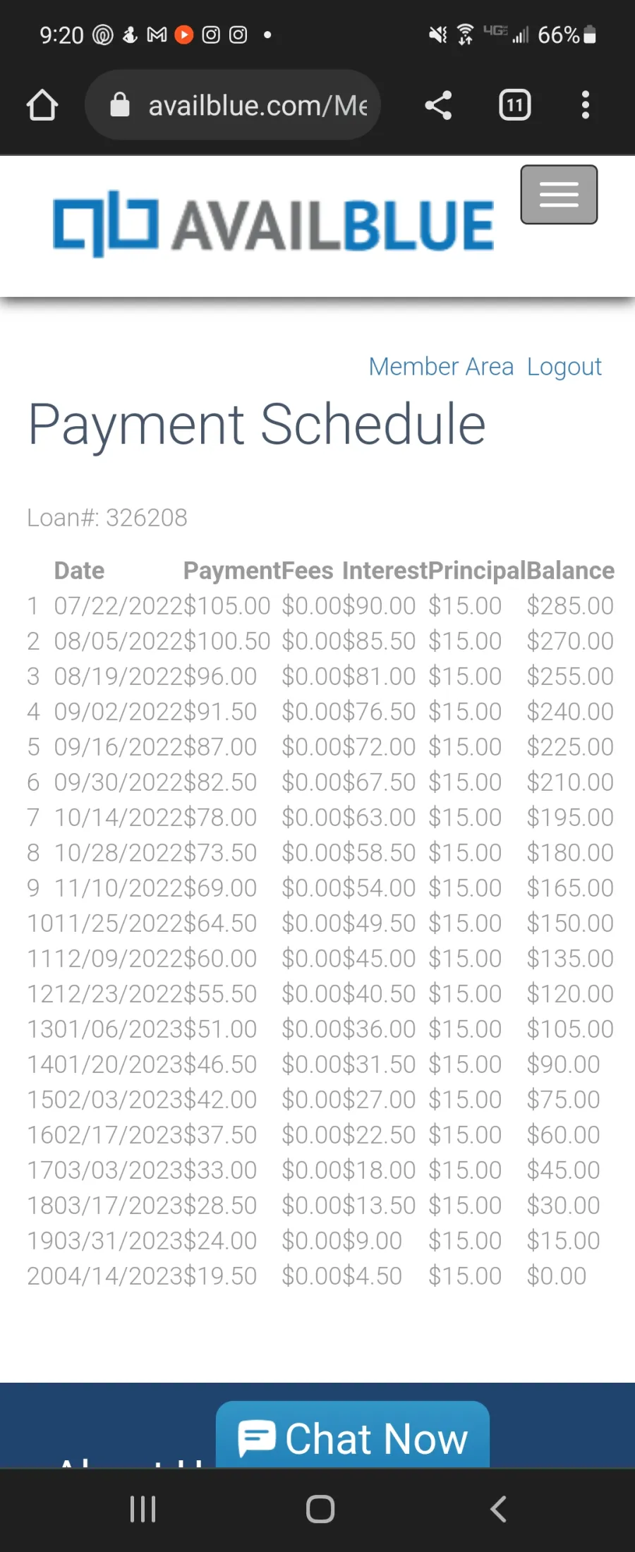This is my so called payment schedule. I was told on the phone that 1. The loan wouldn't be that long and 2. I can pay it off at anytime. We'll I have made two payments I was thinking about going ahead and paying the loan off but after looking at this schedule and reading the reviews it's not worth it. These representatives take advantage of you being I'm a hard place. They tell you what you want to hear I was told my interest rate wasn't going to be high but I look at my loan agreement and it says 384.38% interest. Like where and how can you do that. I only asked for 300 how did my loan end up being 1000 sum. Then someone was supposed to call explaining the payment plan the same day after signing the loan they never did. Because if u would've gotten a detailed explanation I would've just struggled by myself instead of putting myself more in debt.