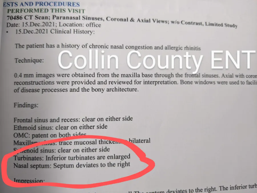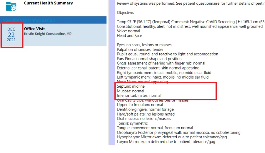 Went in for what I thought was sinus problems in Dec 2021.I was also diagnosed with hypertrophied turbinates ( confirmed by another ENT a week before my visit to this office and a month prior while on a trip abroad) fully dismissed by a shoulder shrug and saying that happens all the time and will go away on its own. I was so dismissied about it that she even wrote down on my chart that my turbinates were normal. As you can see on the picture below there is nothing normal on having two red balls inside your nose !