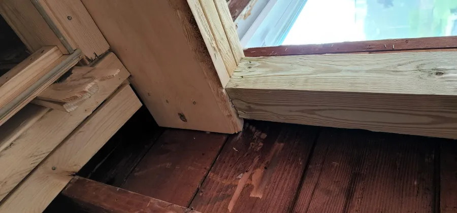 - Cracked wood and gaps in supports.