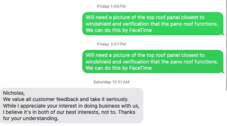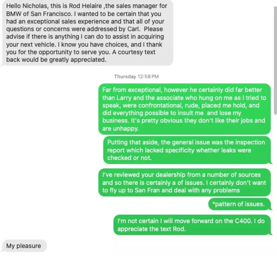 Enter the sales manager. I then received a text from Rod Helaire, sales manager (one of many) who's evidently not in the apology business. He told me what I wanted to hear via text. When my texts for info were requested, he decided to part ways offering no explanation. Evidently Rod can't take criticism when he FAILS to follow up after 2 texts. They can dish it but can't take the heat.