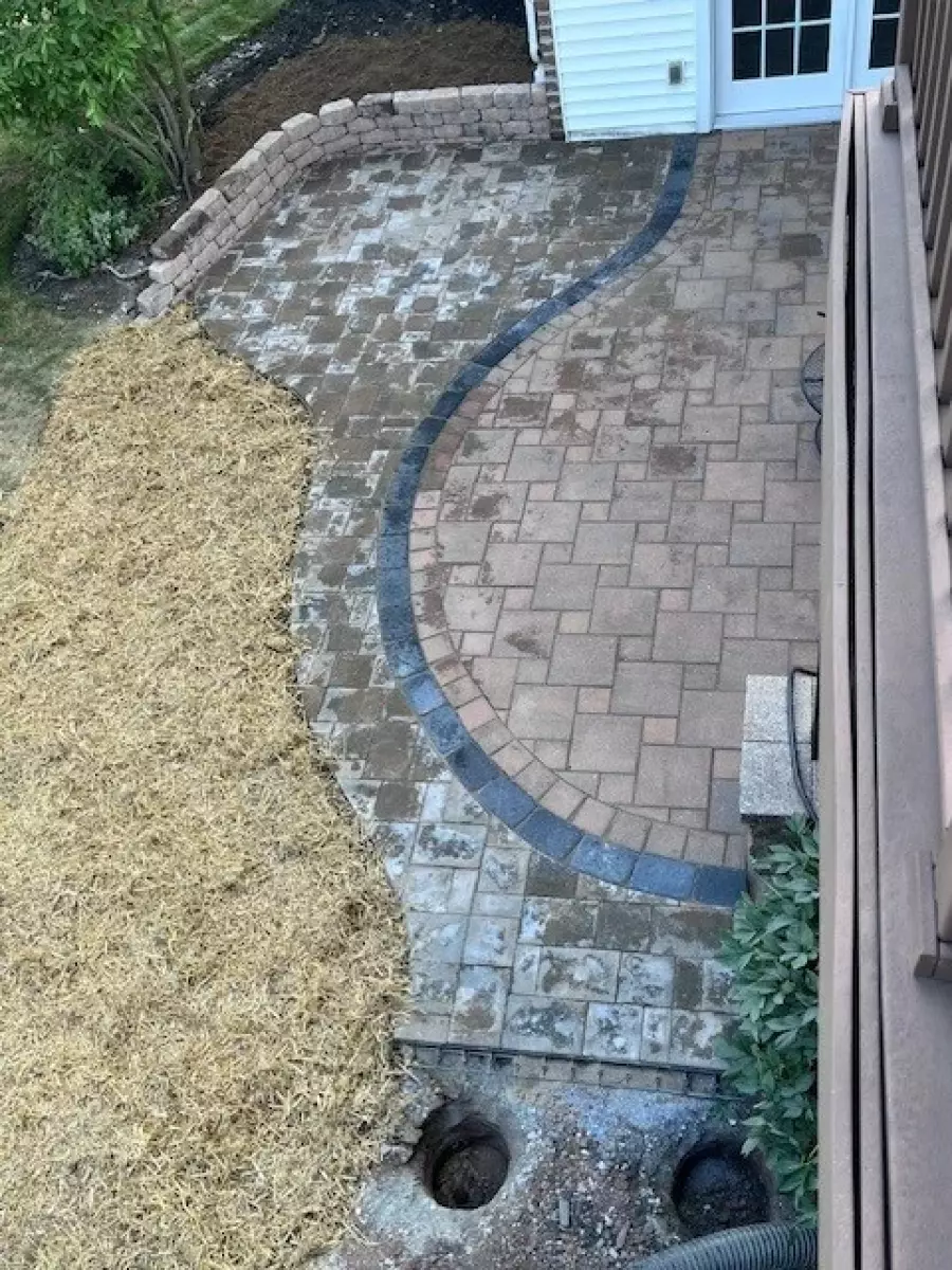 Despite being contracted in March for April/May work their crew did not show up until mid-June. They immediately went to work on walkway low spot while we discussed the shape of the patio (9’x12’ rectangle was physically impossible) and connecting the extension to stairs from an upper deck. There were also decisions to be made on routing roof drainage outfall, and location of the retaining wall for the patio.