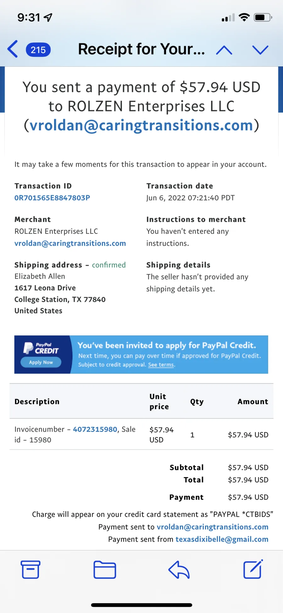 Take a look at the attached documents The donation receipt is blank (That is because the [redacted] doesn’t itemize what is donated that is left up to the family.) and the break down ppwk doesn't belong to me (The break down belonged to another client who did an online auction where we can track the numbers and views With a physical estate sale such as yours, there is no way of being able to provide the same information as we discussed during the initial consultation However, we can and did provide you with the number of views your estate sale received per the contract for advertising Your estate sale was viewed 6,times and that paperwork you have in your possession As for the itemized items paperwork, that was mistakenly placed in your envelope, please disregards)I have no idea what was sold and what we lost to the trash man (It is at our discretion what we donate, what we trash and what we sell per our liquidation contract) I didn't ask anyone to pull employees off of other jobs to take care of mineThat was YOUR decision I never begged you to take the sale That was your decision She told me she had finished a previous job quicker than they thought they would and would have no problem with my sale If you were too busy, you should have said so, and I would have moved on to another company I did want the house completely empty, but if I wanted all of the unsold belongings to be thrown in the landfill I would have done it myself (When we went to the home before starting the estate sale pricing process and to see where the last estate sale company left off, ((after walking off the job)) you were not there and I had the conversation with your husband and it was stated that the house needed to be empty and said and I quote “Yes, have a clean out crew come at the endIt’s been a long process for everyone and that it’s time to get this over with”) You are absolutely right about my sister being confrontational to see all of our parent’s belongings thrown away, because I was assured they would be donated and had told my sister that info(Per our liquidation agreement/contract that you signed (not your sister), it is at our discretion what we donate and what we don’t) The furniture was not stained, damaged, or covered in animal hair(We see household items every day and to us it was) Glassware, dishes that had been run through the dishwasher were thrown out (Please reference the signed liquidation contract) What animal hair was on those items?? There had not been any pets in the house since - years ago!! There was no way for Caring Transitions to put my unsold belongings into another sale - specifically the tapestry antique couch we spoke of on that Saturday - because my sister and the neighbor saw it get cut in half and thrown awayHow was that going to be sold??? (Please reference the signed liquidation agreement) This has nothing to do with being emotional about the loss of the belongings It has to do with what happened after the sale Had my sister not been there, we would have never known everything was thrown away We were told the items would be donated(Some items can and others cannot, please reference our signed liquidation agreement by you) If the charities didn't want the items, they could have gotten rid of the items and we would have been none the wiser(Correct, they won’t take items knowing they couldn’t be resold) But we are wise and we know there was so many things that were thrown away (Incorrect, we made several trips to the [redacted] ) This one reason is why they do not want the owners of the belonging there after the sale (We have had many clients watch what happens after the sale, it is the wise ones that understand that they hired a liquidation company and signed a liquidation contract knowing that the company has legal rights with what to sell, what to trash and what to donate We accomplished this advertising and receiving 6,views and conducting an estate sale per the contract)The company knows everything will be thrown away (Incorrect, we donated hundreds of items weekly to charities, senior communities, churches, ***, [redacted] , schools, [redacted] ***, Disabled American Veterans and thrift stores) This is our first priority of all un-sellable items Kim was not there when the trash man was there so her version of events is whatever she was told by the trash man My sister and the neighbor were eyewitness's to the actually event The behavior of the 'clean out crew' drew the attention of neighbors because of the loud noise of them throwing glass, plates, cups and furniture into the dumpster (They are a clean out company and was scheduled during the day, 2pm exactly, not after hours or early in the morning when people can be disturbed) The neighbor, who has no skin in this game, was incensed at the way the items were being destroyed The house was left unsecured by the company that Kim hired (Incorrect, Everything was locked and the garage door was closed) The garage door was left unattached to the door opener(We have no idea as to why the garage door mechanism was unattached to the door, the clean out company locked everything up closed the garage door using the garage door button mounted to the wall and stepped over the sensor in order to let the garage door close all the way)Leaving a couple of voicemail messages does not relieve them of their responsibilities (No, but it does open the line of communication in order to get your key back, that was the reason for my calls) There has been no effort to give me correct paperwork or to return my house keys (Incorrect, You should have received an invoice detailing how the physical estate sale did As for the itemized numbers of items and number of views each item received, that’s only if you would have done an “online auction” which we talked to you about during the consultation As mentioned above you would have received your keys if you would have returned all the phone call messages we left but never returned 