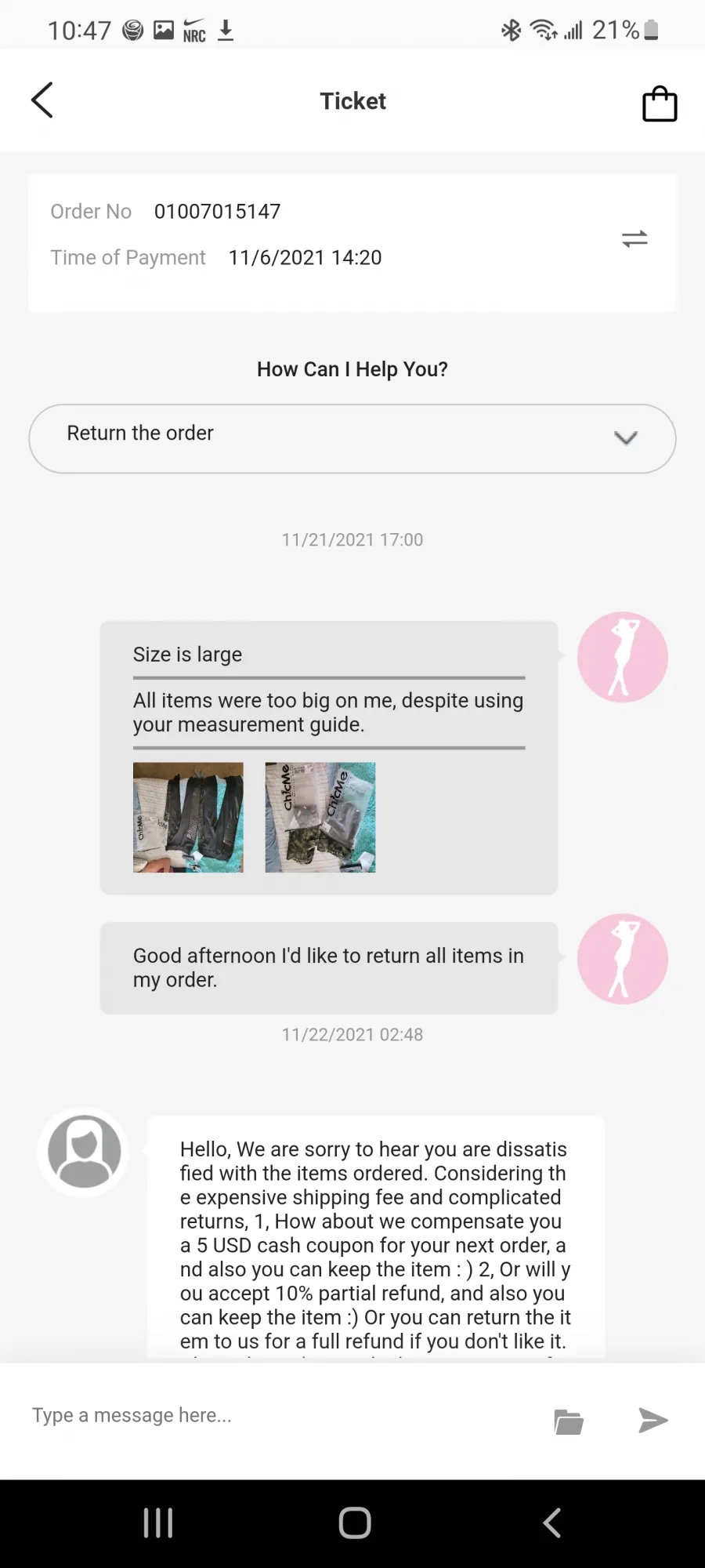 The worst company ever! I placed an order in September that just arrived a day agoI was extremely excited couldn't wait to try it onWell I will never be able to try it on or wear itI ordered an xlarge lime I always do and wear and the shirt that showed up is marked and tagged xlarge but isn't vendors closeI have a nine years old daughter who is tall and slender and she can wear the shirtNow how in the world can you expect a grown women with some curves to wear something a nine year old bean pole can wearIt isn't gonna happen and the quality of the item is poor at bestYou can see through the shirtIn order for my daughter to even make use of this item she will have to wear another shirt under itSending it back would cost me more money and time as well as frustrationThis is the worst app/company everThey don't even have customer service listed on the app that should have been a red flag to begin withAnyway any "real" ladies out there don't order from them cuz the pic shows women wearing these clothes and my nine years child can wear it