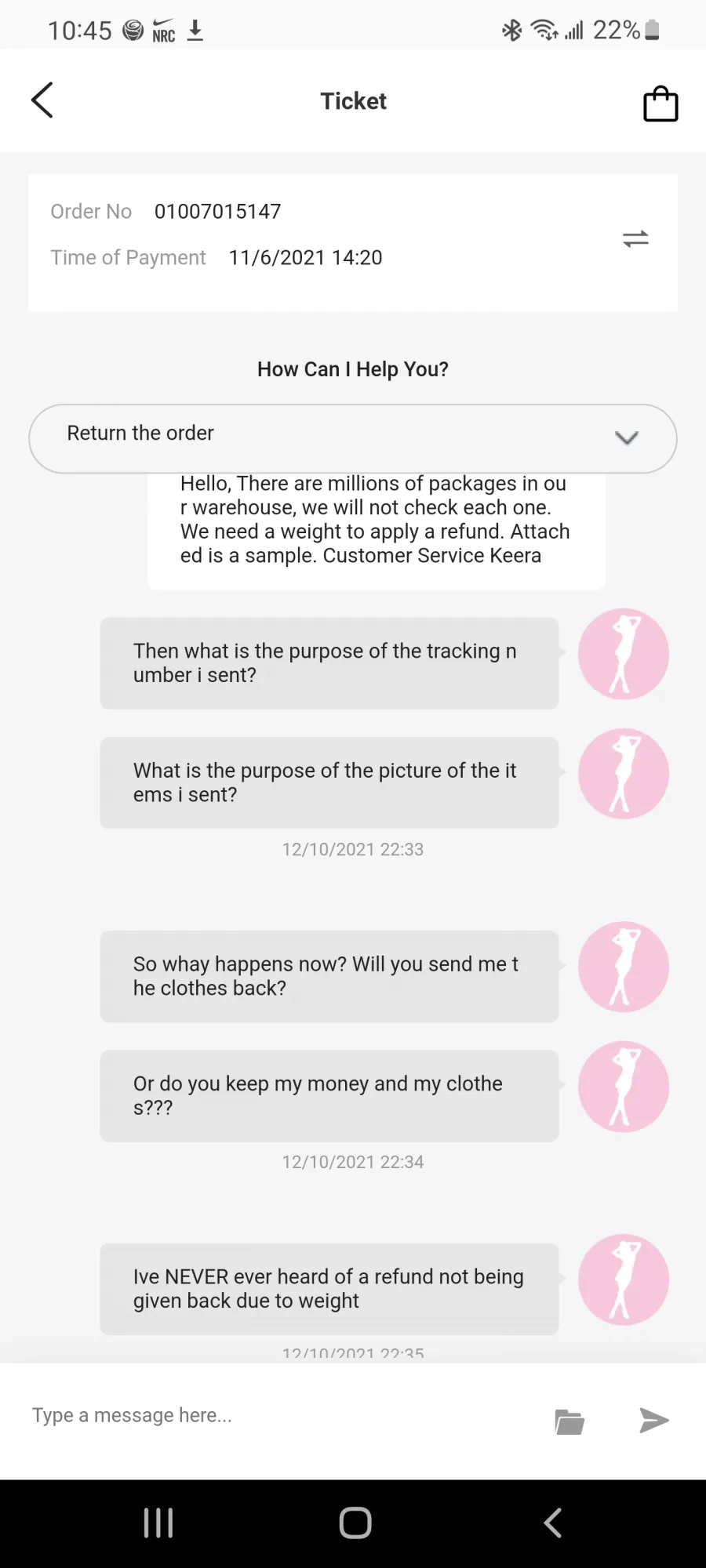 I spent nearly £on the website and it has been a complete wasteI have requested a refund on everything I have orderedI will be sending the things back I have received and the things I haven't I have asked for them not to be sent out to get a full refundAll the items have been such poor qualityClumps of threads hanging from the material, thin cheap see threw material used and the fit on everything is so bad! I have also ordered a dress which they sent me through the completely wrong itemI asked them to send the correct one which I am still waiting for so have asked them to not send it to me and give me a refund! I ordered another item with adverting stating different lettering down the legs and when I asked for a full refund I was told they wouldn't pay for my postage It's sure to say I will never order from this site again and I want a full refund for all the items I have ordered