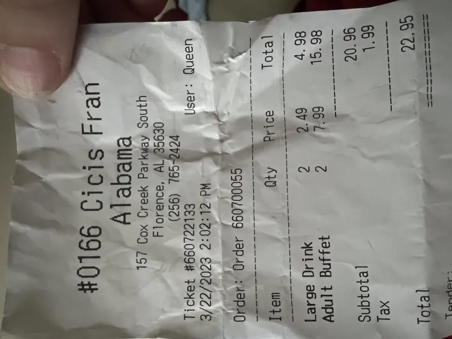Requesting refund for not getting service.Me and 3 kids went to Cici's Pizza (#157)on April 18, 2014 to enjoy their buffet. I was very disappointed. We paid for a buffet, but we did not get a buffet. After we got our plates and glass at the register after paying for the buffet; we got in line to get our food. There was only 3 pizzas on the buffet. The kids got some pizza but I waited to see if they were going to put more pizzas up on the bar. The kids were not hard to satisfy since they only like cheese and pepperoni pizza. I was disappointed because there was only 1 cheese and BBQ and some other kind of pizza. The salad did not look fresh and the floor was nasty (dropped food). I am requesting a refund for not getting the buffet that I paid for. I contacted CiCi's Pizza before filing this complaint and after missing a call from Mr.[redacted] on 4/24/14 and calling and leaving a couple of messages for Mr. [redacted]; I finally got a chance to talk to him on 5/12/14 at 8:20 p.m. Mr. [redacted] said that he called me to discuss the problem I experienced at CiCi's. After telling Mr. [redacted] my issues; he seemed to have gotten upset because when he asked me certain questions I gave him answers that he did not like. (l) He asked me why did it take me a week to file a complaint. I told him that it did not matter if I waited a year, I had a problem and that's all that mattered. (2) He asked me did I talk to the supervisor on duty that day. I told him that I did not because he was busy helping cook and and it did not seem to be but 2 others helping in the kitchen and the person at the register. (3) He asked me did I think it was the problem of shortage of staff. I told him that I did not know but that he would have to ask the supervisor. I was just letting him know what issues I experienced. He asked me did I ask them to make me a special order and I told him no. I also said that if he goes to a buffet he expects a buffet. I asked him about a solution and asked him for a refund. He told me that his store does not give refunds. I told him that was not true because people give refunds all the time. I told him that I would file a complaint with the Revdex.com. I hung up. It is ashame that people can take your money and not give the service that is expected and then get smart when a problem is brought to their attention. I am a customer and this is bad customer service. Desired SettlementI just want my refund for the pizza and drinks that me and my 3 kids had on that date. That's all.Business Response I spoke with the guest. My company does not refund money after guest has eatenConsumer Response (The consumer indicated he/she DID NOT accept the response from the business.)This is not printed on the receipt that I still have, nor was it posted in the store anywhere. I did not eat all of my food and one of my children told me "mom, just don't say anything". This place was not up to part for a restaurant. I hate that this owner is mad at me because I did not enjoy my visit. If I were a business, I would honor the guest's request especially if they did not enjoy the buffet (which I did not receive) and it was not up to part. It is ok if he does not honor a refund even though it is not on my receipt nor posted at the restaurant. I will not give my business to this establishment anymore.