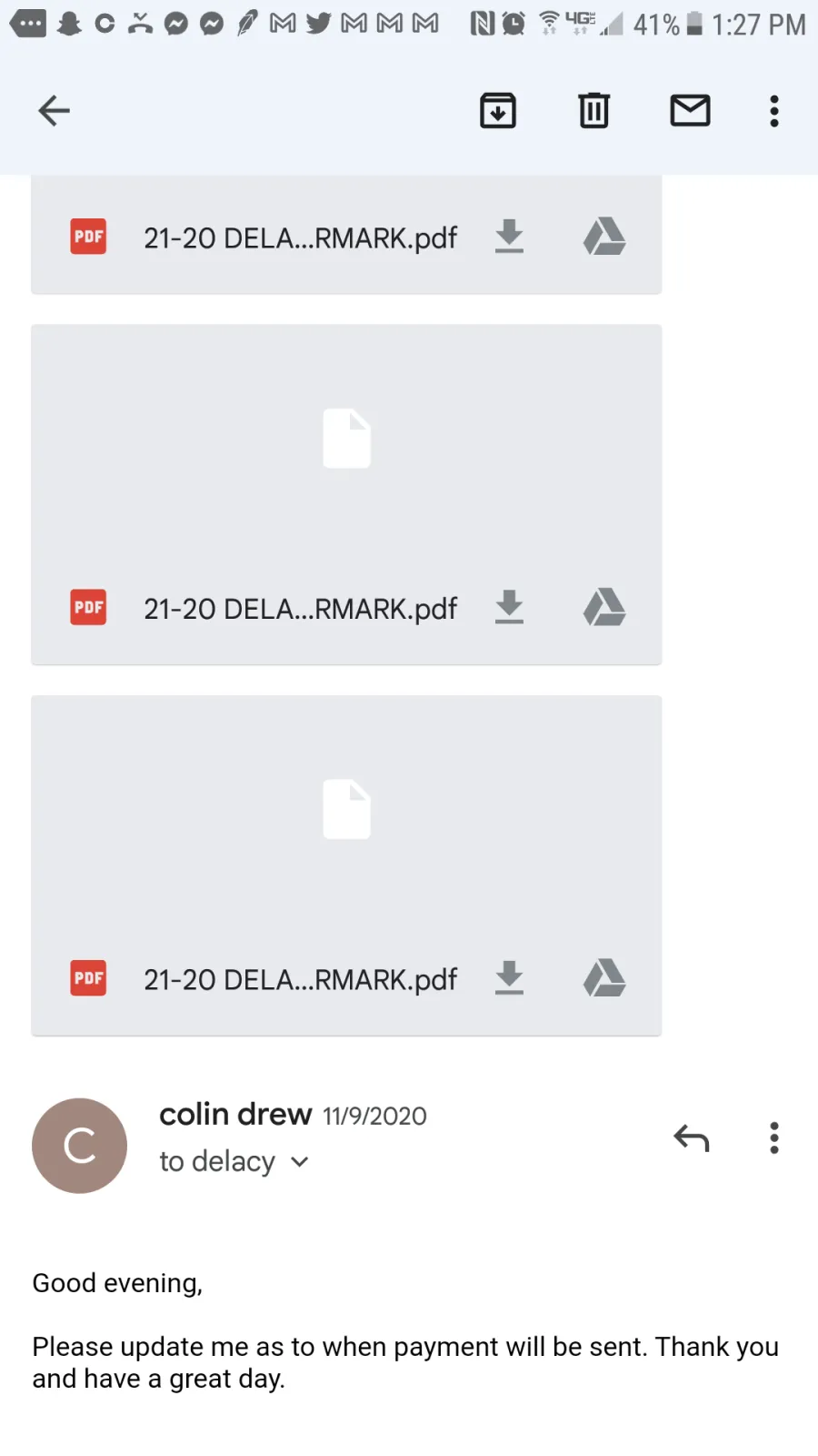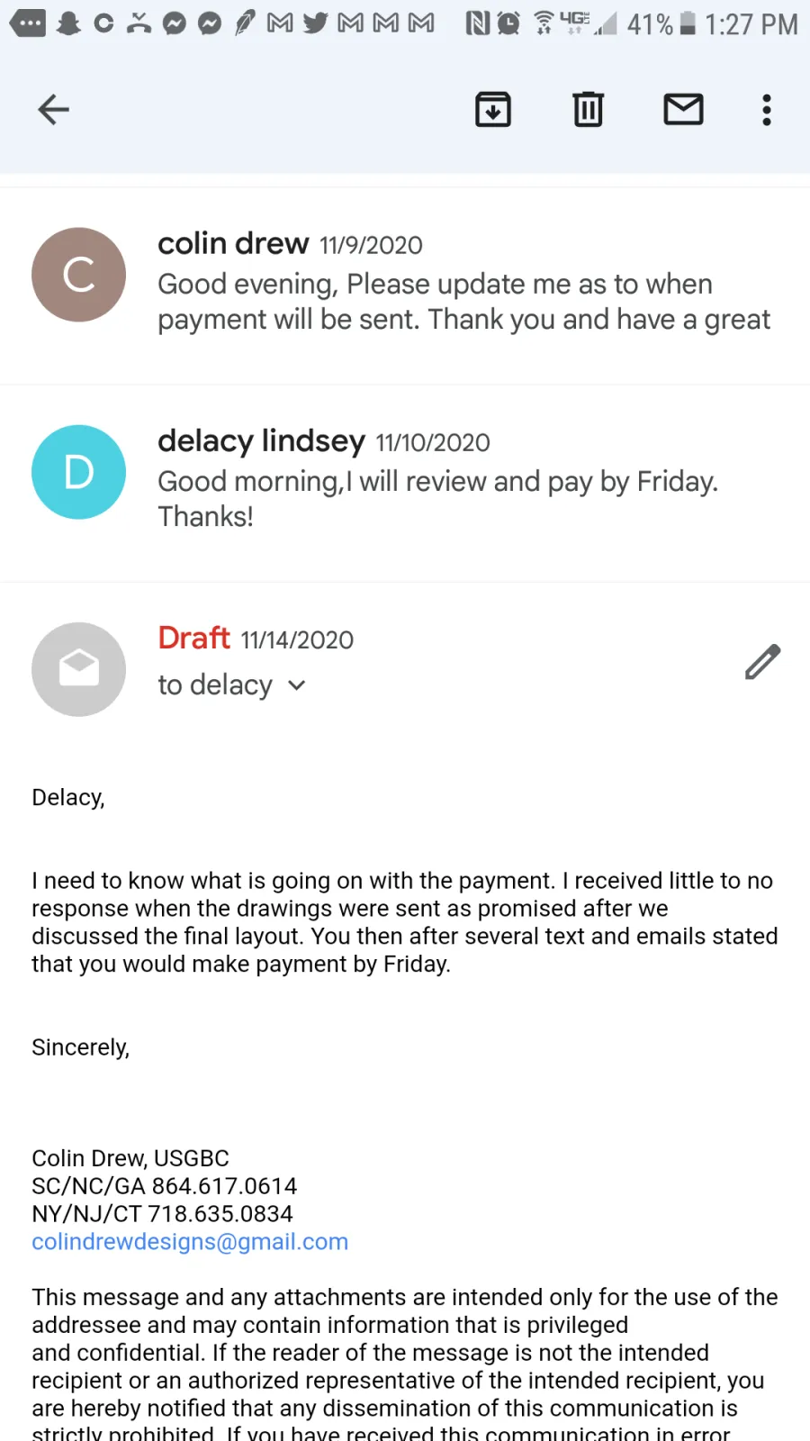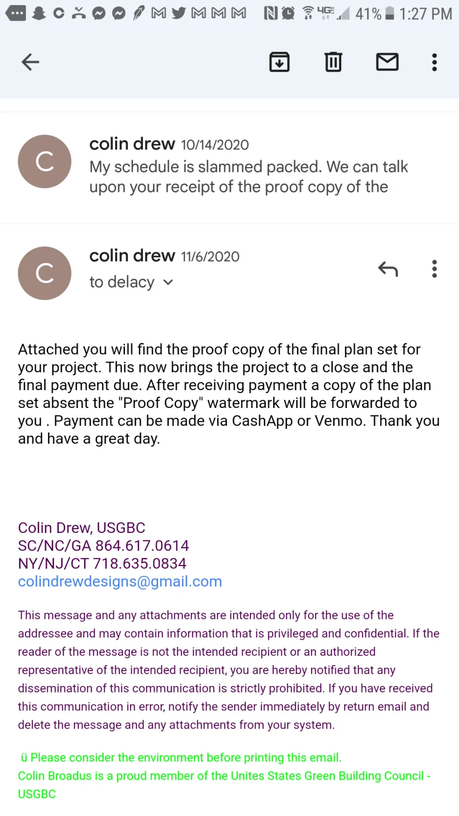 Thats interesting. Attached are will screenshots of the emails where they were sent and you can see in the emails where I had to practically neg you to make payment after such an extreme sense of urgency was displayed that magically disappeared as of the moment you received a final invoice. You guys often forget that you signed a contact acknowledging that final payment is due upon completion of plan set when breathing down my neck and throwing temper tantrums because you didnt get real time responses to emails at midnight after ignoring my calls.and emails made and sent during actual decent/business hours. Not due 3 weeks after or when you feel like finally ceasing to avoid me. Not when u decide to look at them a month later.