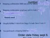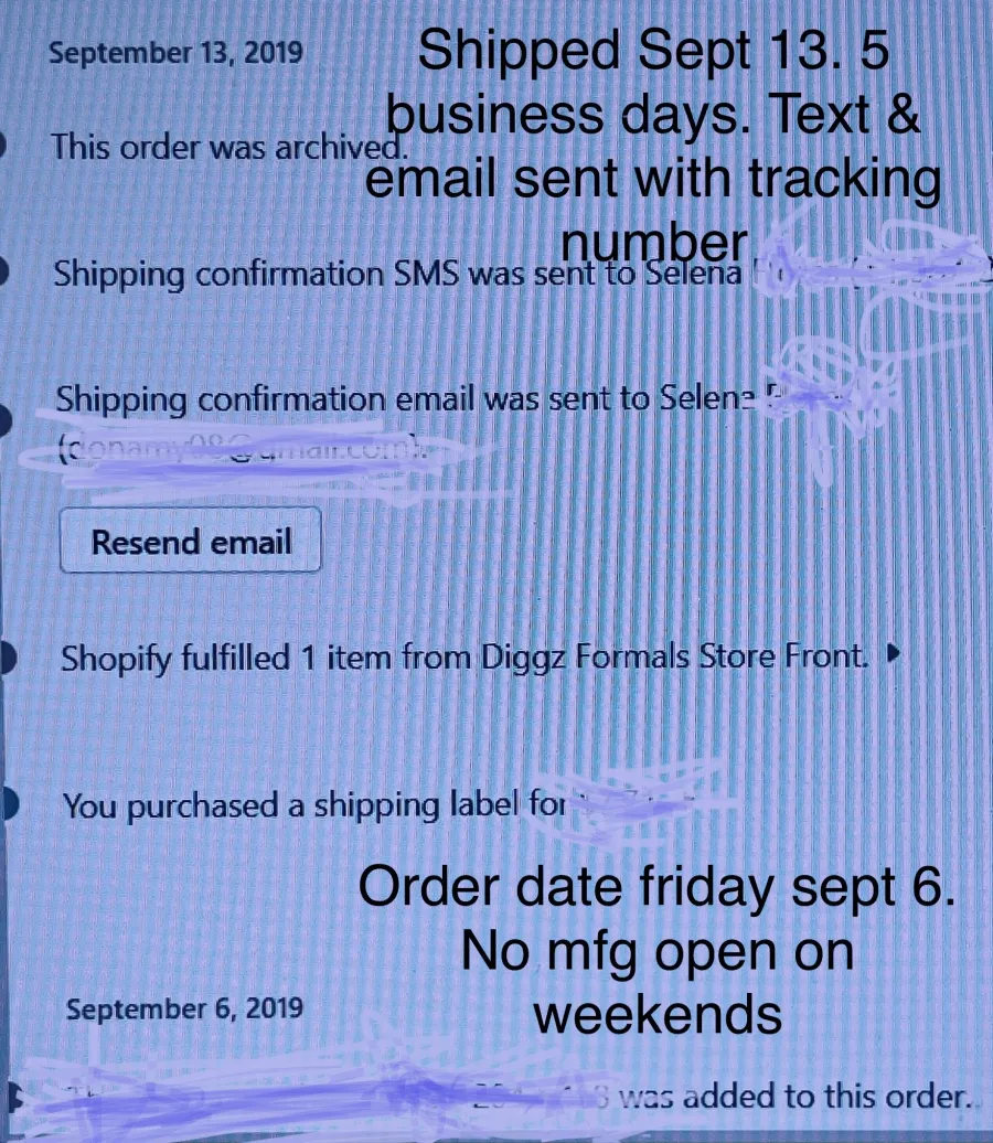 Order placed on Friday Sept 6. (No manufacturer is open on weekends). Order shipped on Friday Sept 13 with a tracking number provided and sent to her email and her cell as a text . The payment was through PayPal Express.
