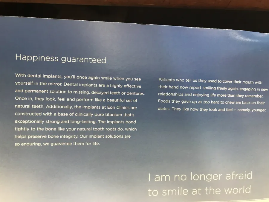 This business over promises and under delivers. Our first visit to EON was wonderful. Everything was explained in detail. It went downhill from there. We had lots of problems getting my husband scheduled for surgery. He showed up for his pre-op visit and was told they wouldn’t see him because he didn’t have a cashiers check for $34,000. He was never told to bring in a check. They were supposed to file with our dental insurance companies for reimbursement, but never did. This required over 20 phone calls back and forth to EON, management and our dental insurance companies. We finally received our reimbursement monies from insurance over 7 months after surgery. My husband had the procedure to remove his teeth with temporary teeth placed over 1 year ago. He has had temporary teeth for over 1 year. They are designed to last 3 months. They have cracked twice, requiring unnecessary trips to EON for repair. When contacted to inquire when his teeth would be ready on 1 year anniversary of original surgery, he was very rudely told that they called him numerous times and sent multiple billing statements. We received 1 statement 3 months ago. No phone calls. They stated that he will not receive his permanent teeth until he pays the balance of $14,500. We have a cashiers check dated 5/19 for $14,500 that they never asked for. We have been carrying this around for more than half a year. I feel like EON is extorting us in order for Tim to receive his permanent teeth, even though their service has been horrendous and he has had to endure temporary teeth for 4 times the recommended amount of time. He has asked for a discount on the balance due to their constant unprofessional behavior. No response from EON. We don’t feel like we can negotiate with them because Tim will never receive his permanent teeth.