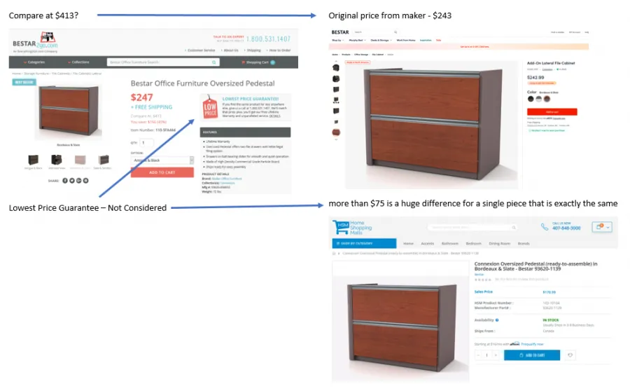 This is very unsettling as many items which tend to be boasted about are not honored or even attempted to be honored. Price match site was "https://www.homeshoppingmalls.com/connexion-oversized-pedestal-ready-to-assembl...⇄ but I was never able to get this far in the conversation with your rep based on the above "caveats" to your products and ordering process.