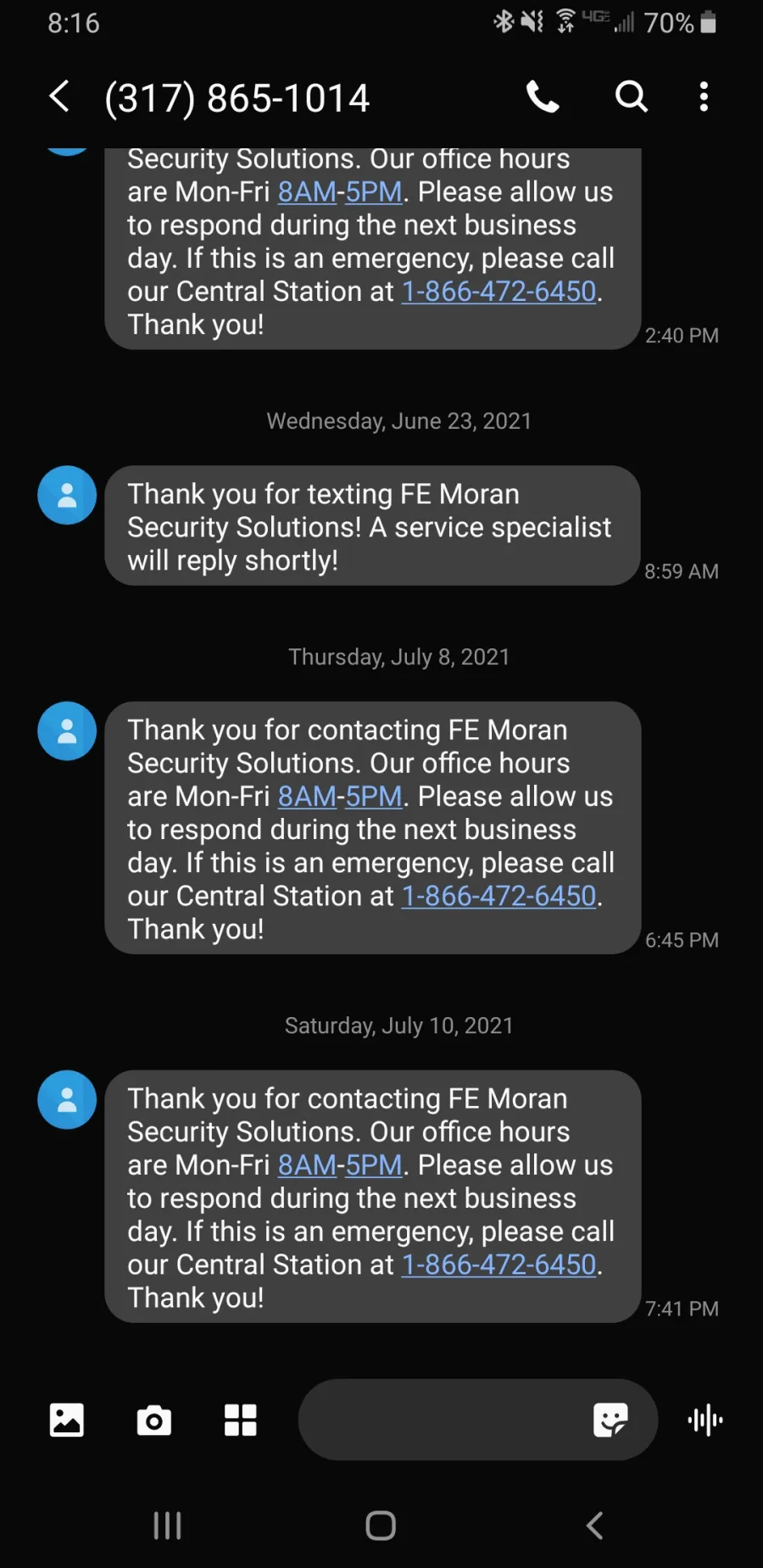 I don't want to speak specifically about their service in other areas. I am not sure yet how it does in an actual emergency, but my issue has to do with the way we became customers of F. E. Moran. It may be a very reputable, diligent company. I just don't think it should be legal for customers to be forced to use companies without their consents.