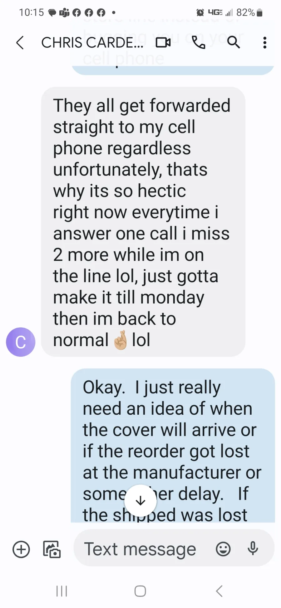 * 10-6-2022 Text message replies that Chris Cardenas sent everything over to them before for the reorder before he left town and he was in New York City and that I should text him tomorrow afternoon for a response.