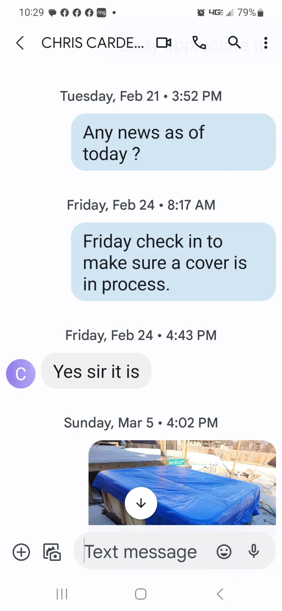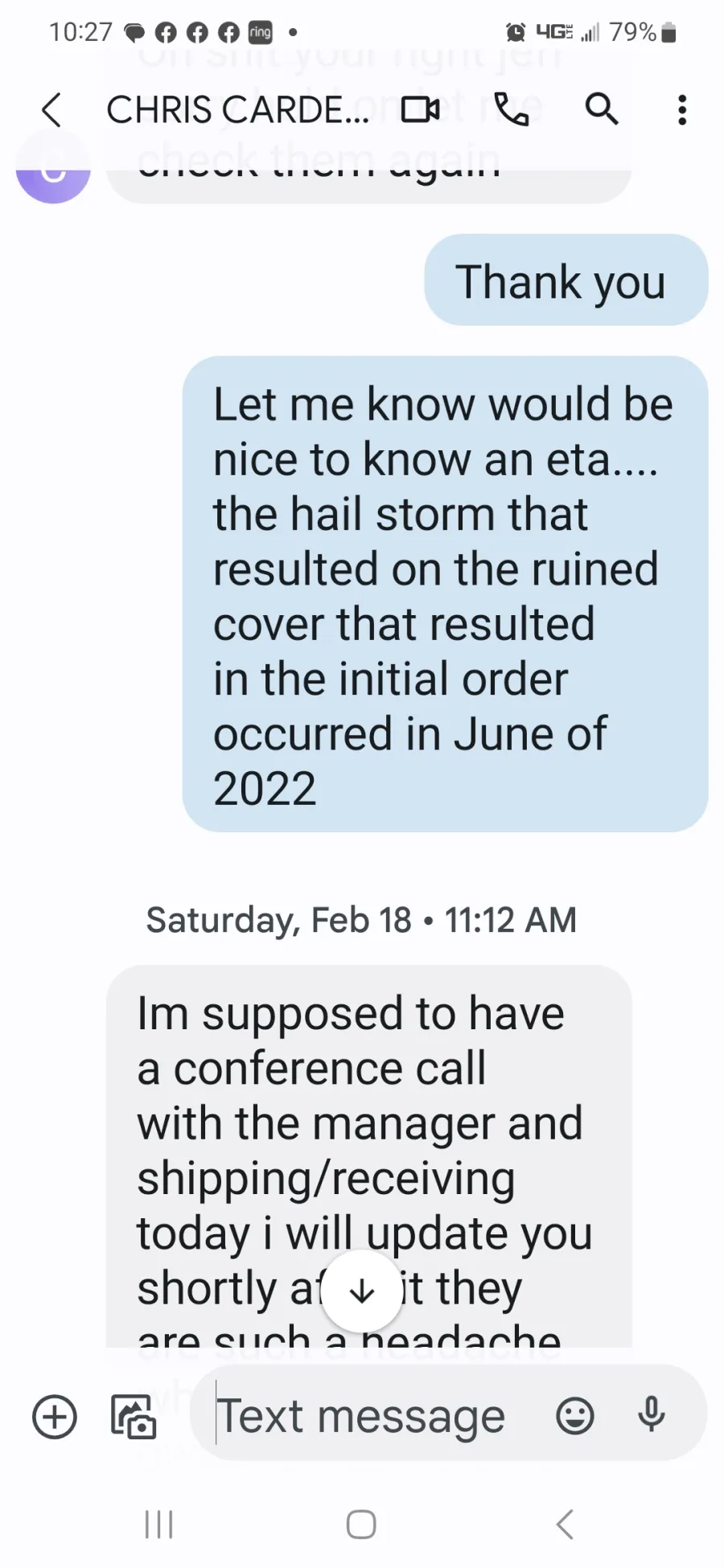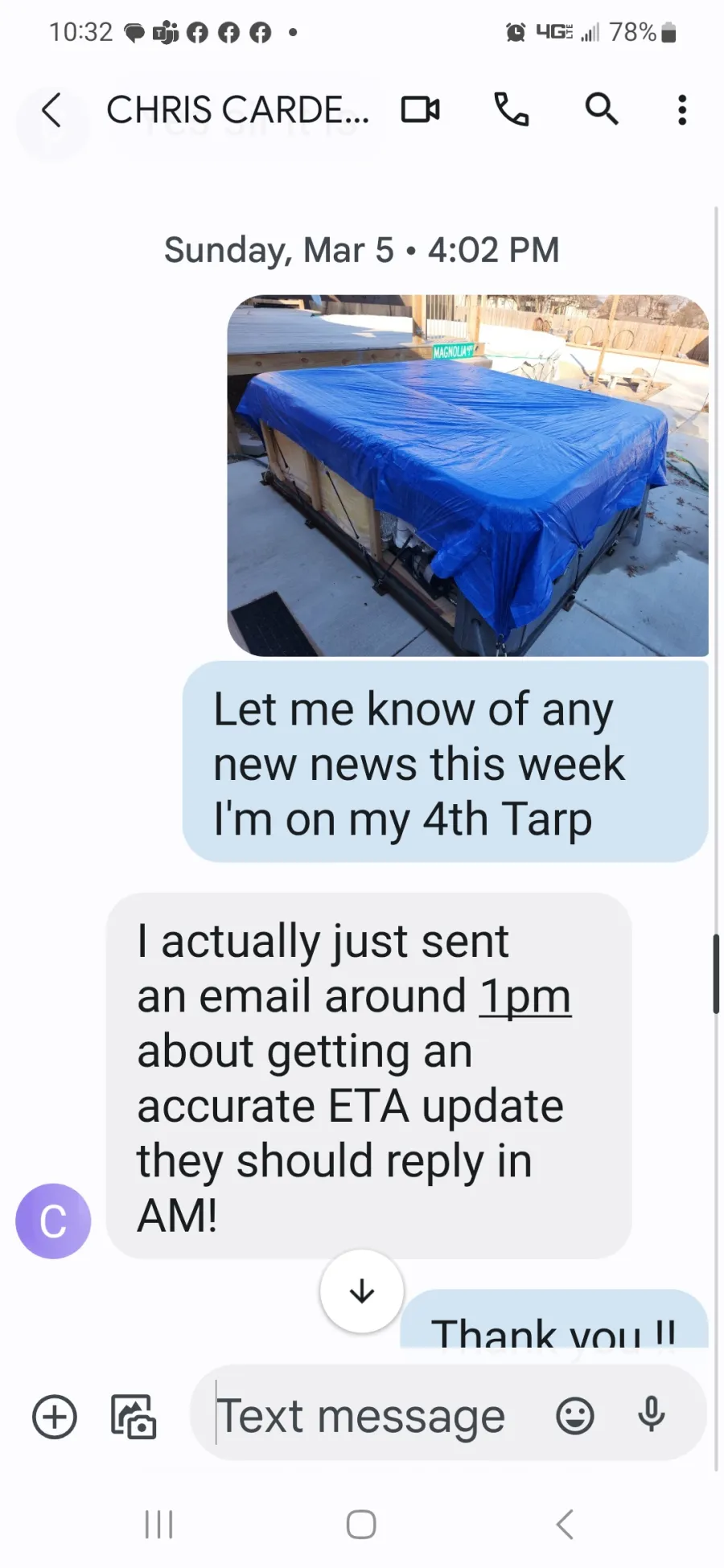 * December 13th 2022 -- My Text" Any tracking number on the hot tub cover - Meant to call you today ?" No response