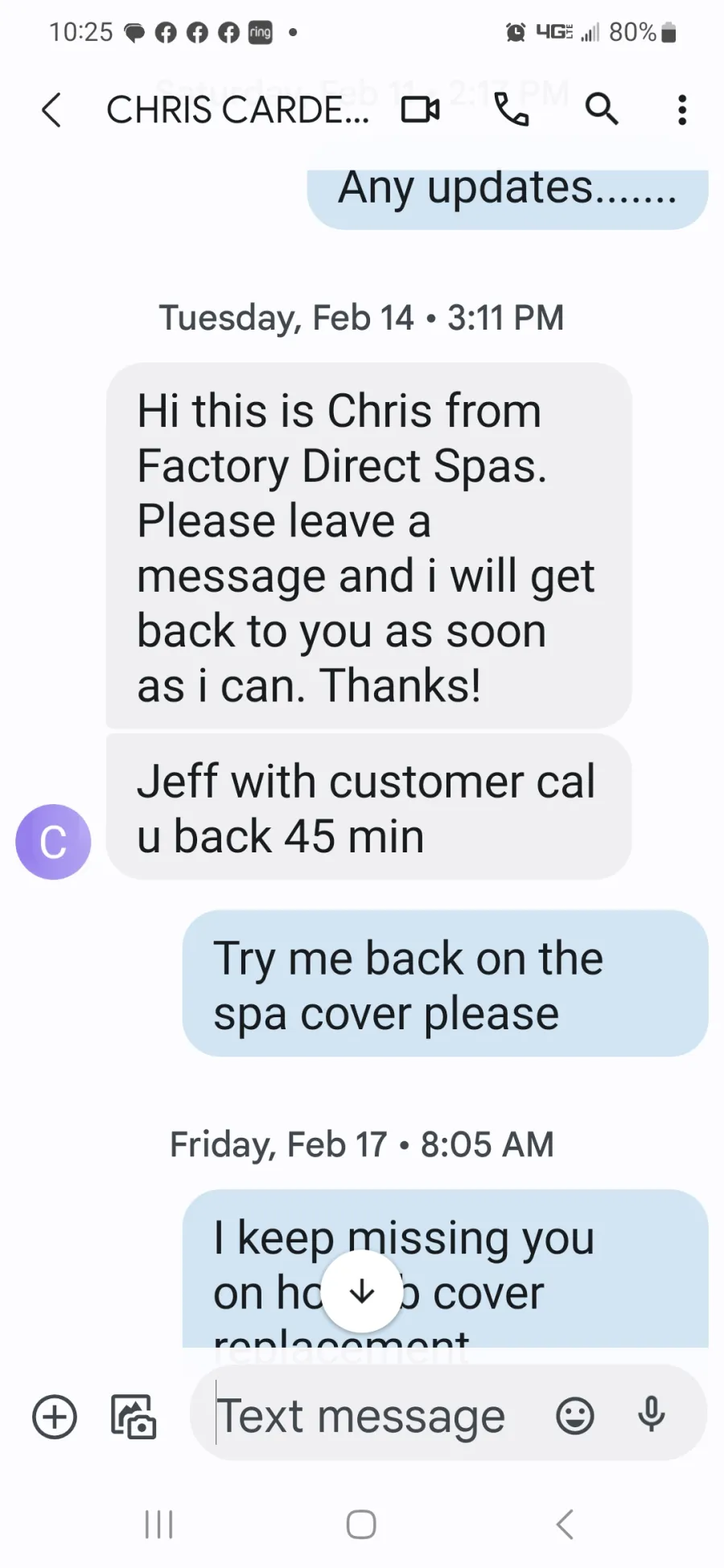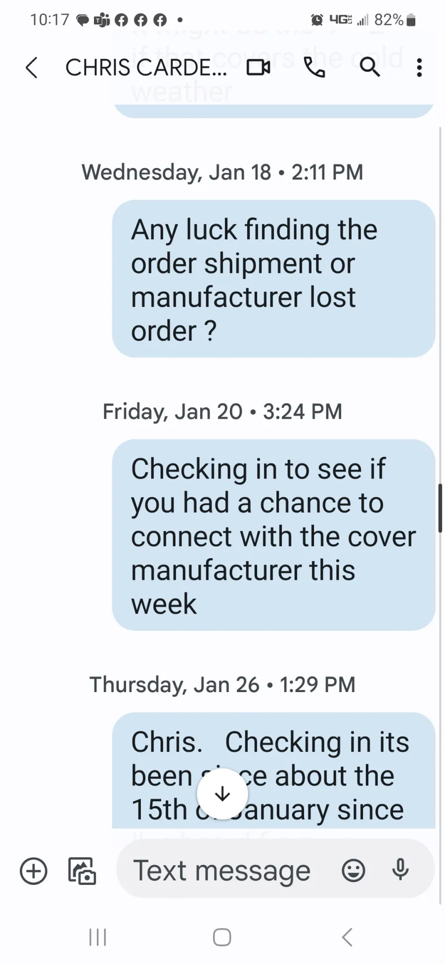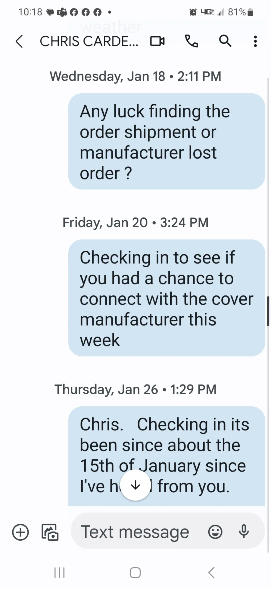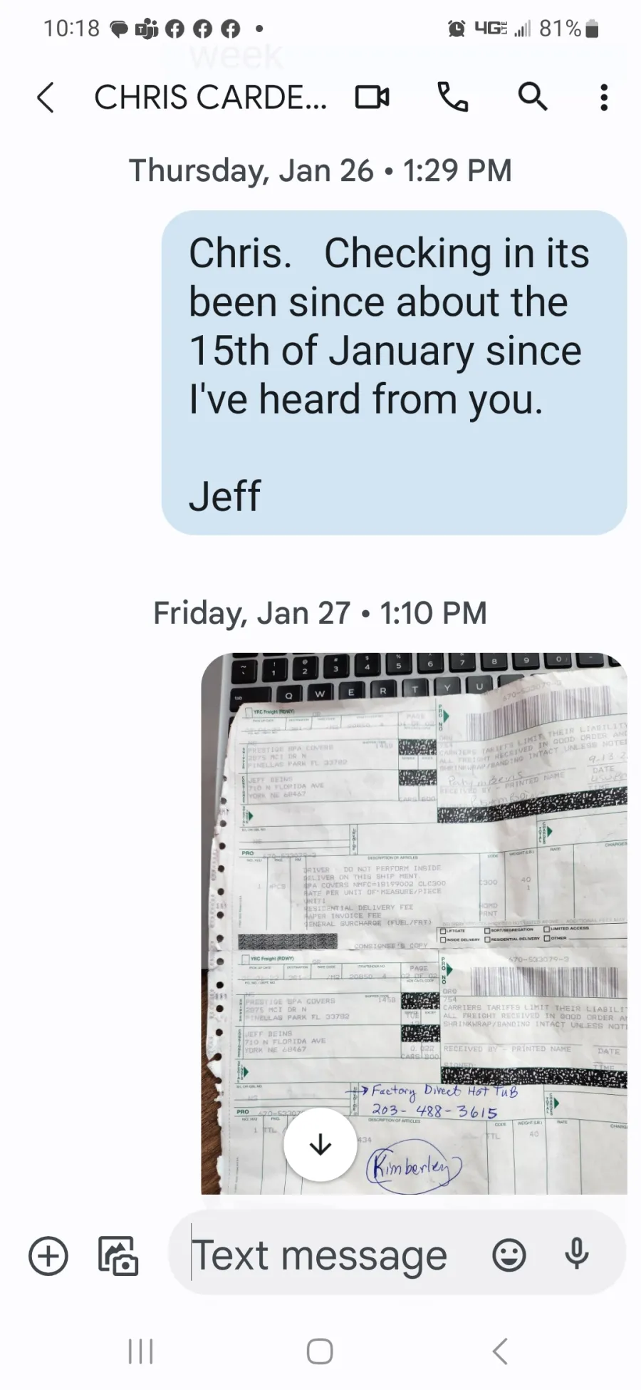 * December 13th 2022 -- My Text" Any tracking number on the hot tub cover - Meant to call you today ?" No response