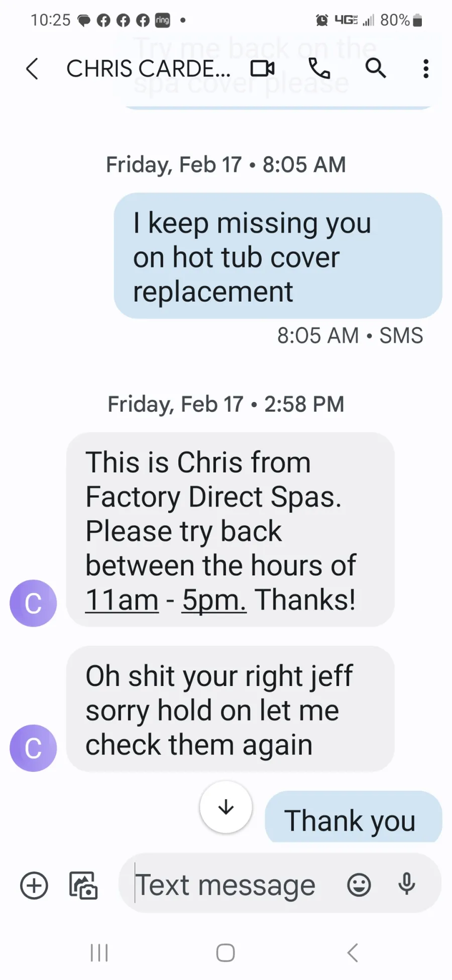 Chris Cardenas's Response Quote " Hey jeff gotcha almost at my desk, was off yesterday