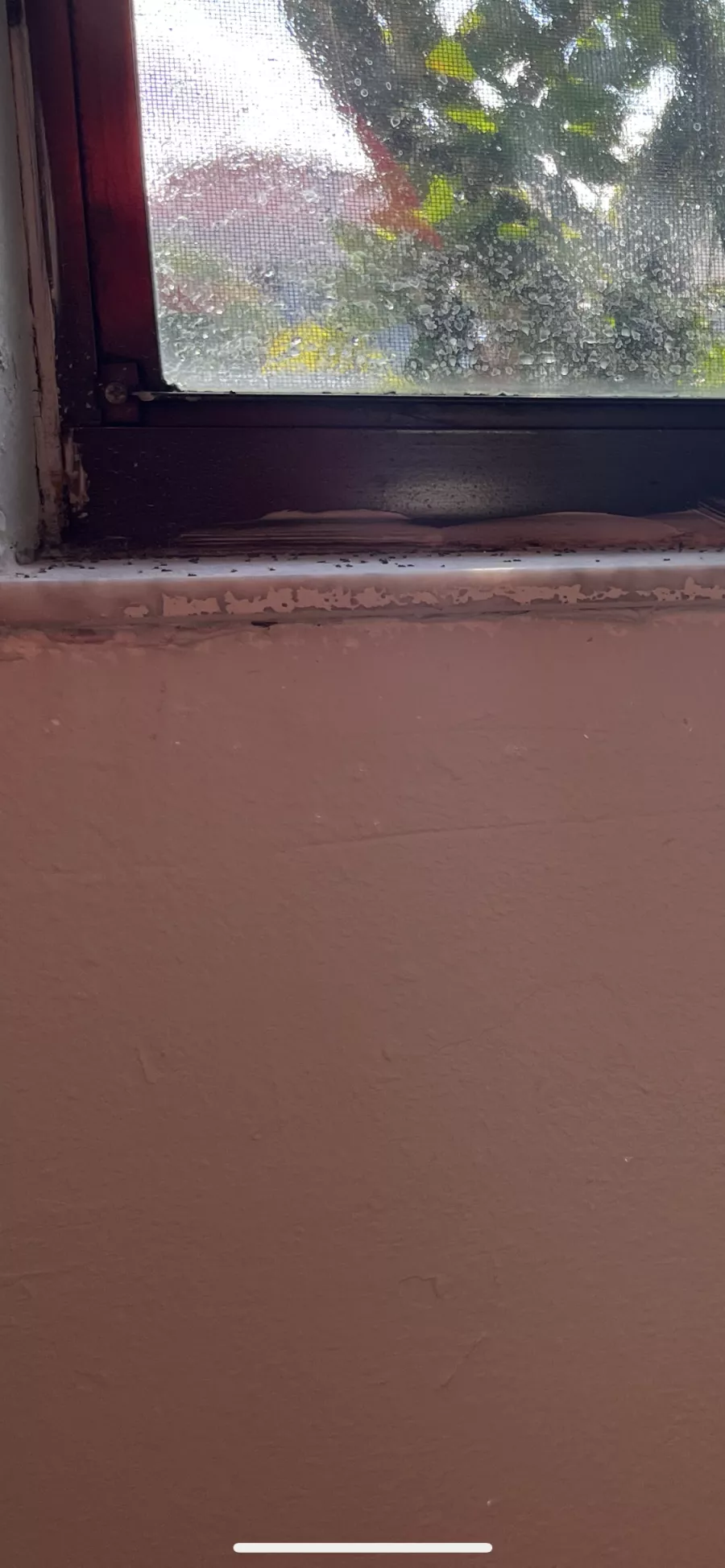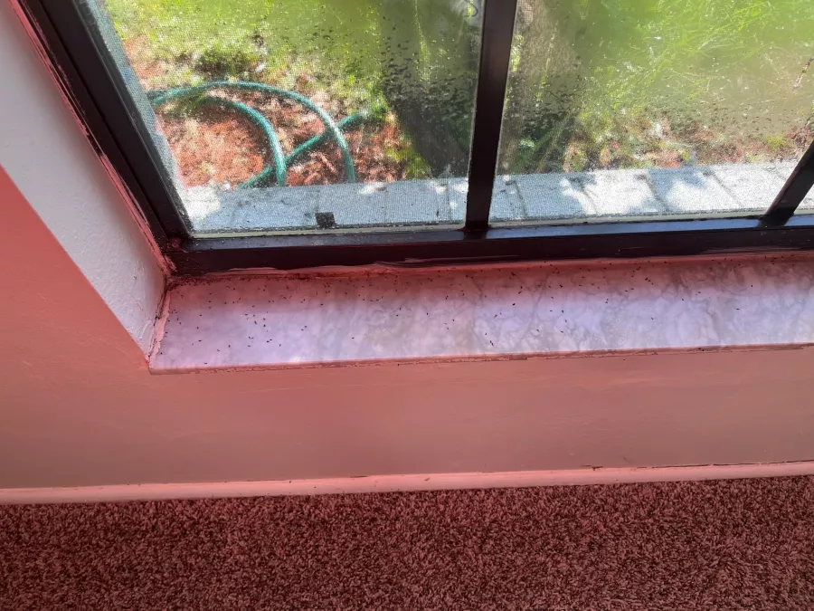 1. First, the front bedroom with the carpeting, the sheetrock under the windowsill is wet so water is getting in somehow. And there are holes where masses of ants are continuing to come in. I have included pictures of the inside sheet rock and the outside picture of the window.