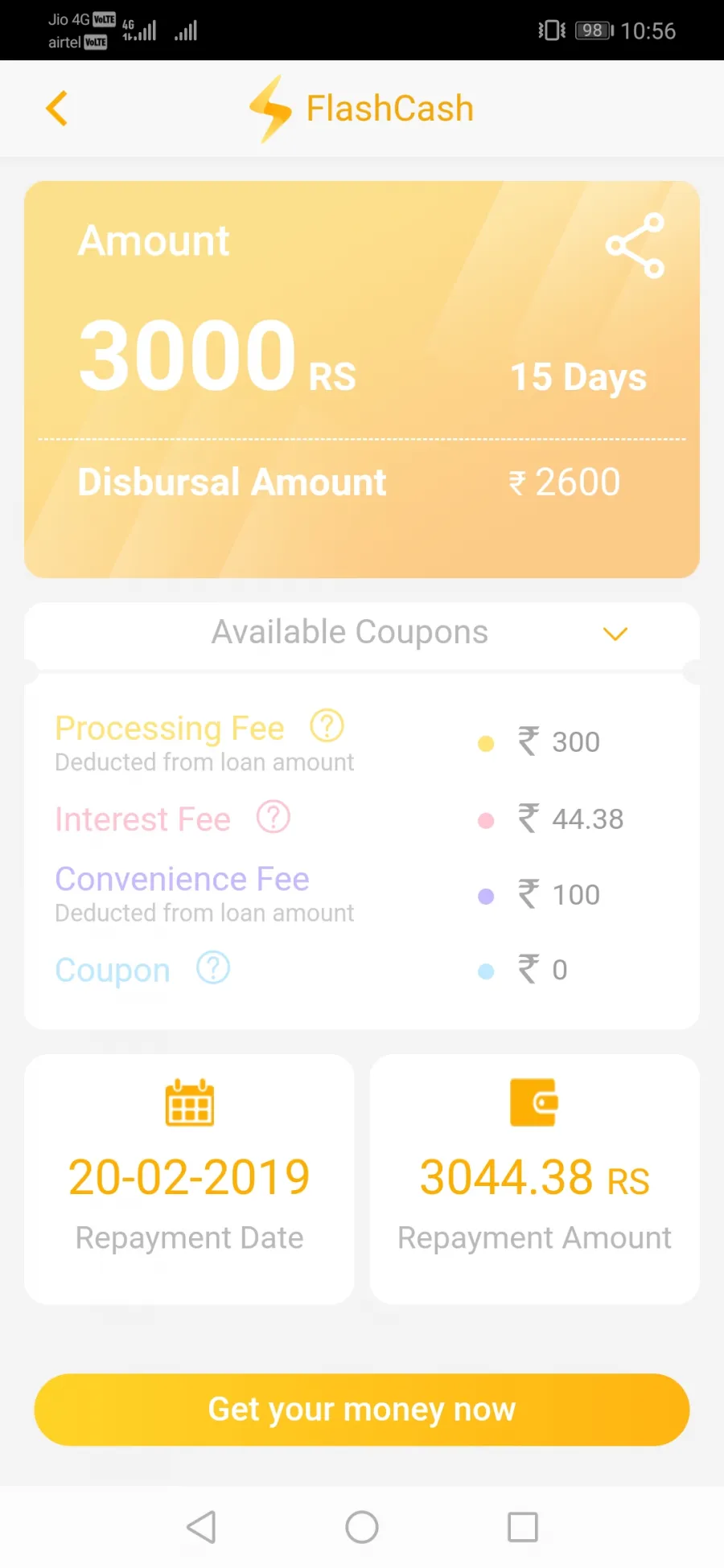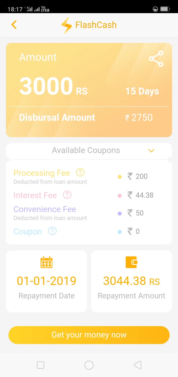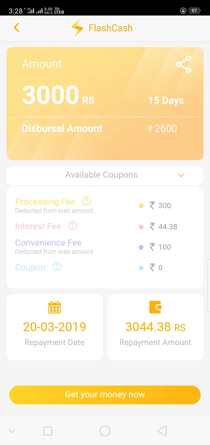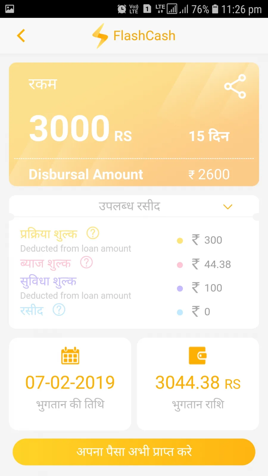 Its showing not paid yet and now payment showing with panelty 350 extra so its very bad service and same inform to flash cash