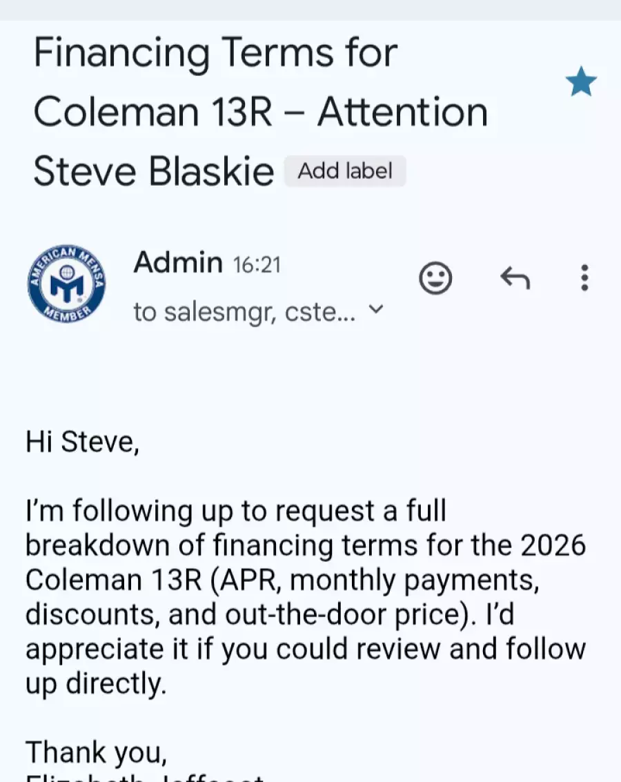 I had a very disappointing and frustrating experience with Camping World of Richmond. I reached out as an out-of-state buyer to ask for the APR, estimated monthly payments, available discounts, and full out-the-door pricing for a 2026 Coleman 13R.