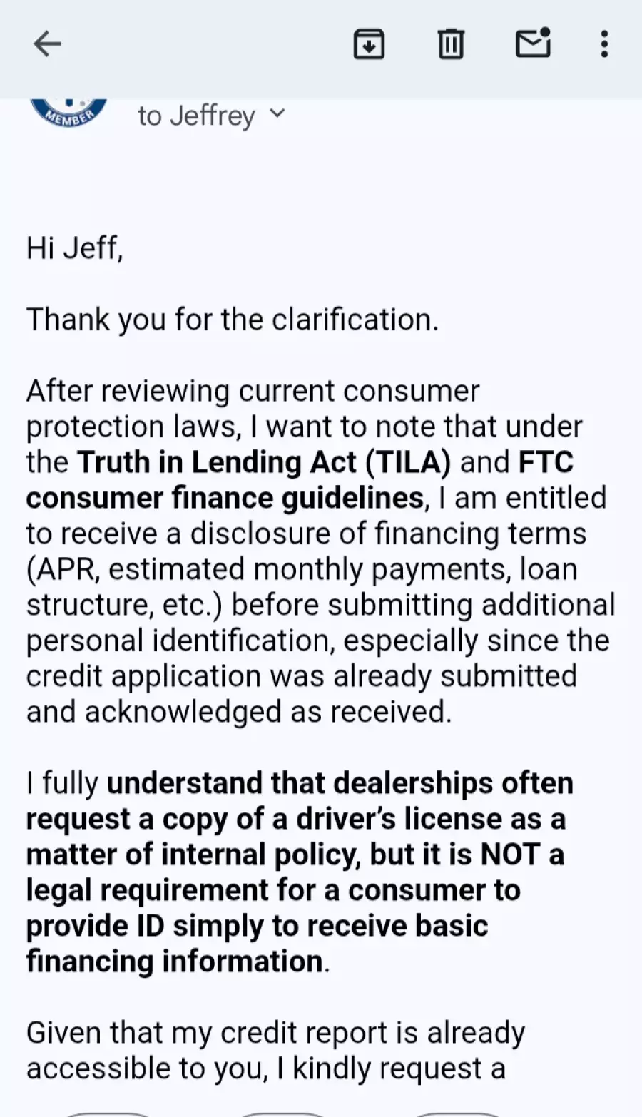 When I cited my rights under the Truth in Lending Act (TILA), which gives all consumers the right to review credit terms and costs before agreeing to credit or providing additional sensitive ID, the communication was cut off and I never received a response.