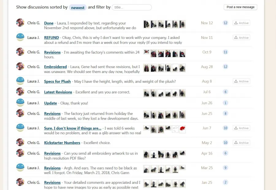 I hope the costly lesson I learned from my mistake will steer next person towards a trustworthy professional whom does not want to steal and pillage and dissolve his business and have the system protect him. He has also lost credibility with producers in China and probably cannot even produce more plush.