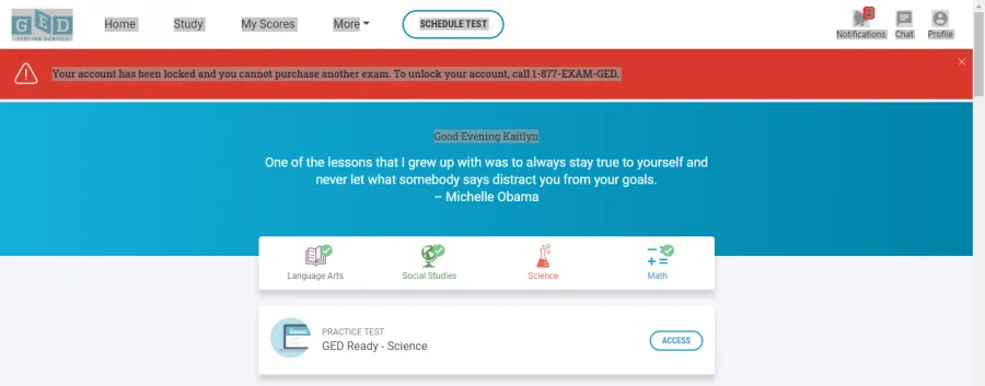 I was charged $240 for a test and only 4 of the 6 charges were dropped. When my bank disputes the 5th charge Ged locked my account and refuses to schedule my last test. I tried the new online option and purchased a GED ready test as required. Ged charged my account for the test, but when I tried to take the test they informed me my account was still locked even though they still charged my account .