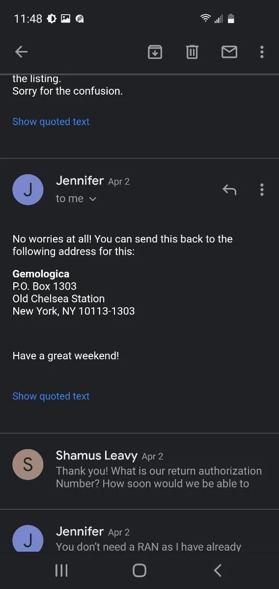 To whom it may concern, This response is in regards to complaint #[redacted] At Gemologica we take customer service and our feedback very seriously. It is our practice to correct every situation possible to our customer’s satisfaction. We do acknowledge a delay in reshipping out our customer's proper...
