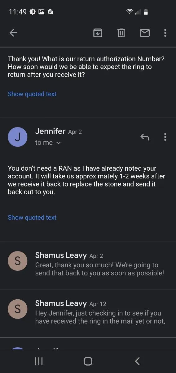 gemstone to repair this ring which has taken us longer than expected to receive. The completed ring will be shipping back to the customer on or before next Tuesday, April [redacted].Best regards,[redacted]