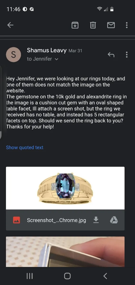 To whom it may concern,This response is for complaint # [redacted] .We responded to this customer within hours of receiving their first emailWe had provided them with a prepaid return shipping label (which I have again attached to this response) to address any issue with the stone that they were stating and promised to resolve it promptlyWe suggest that the customer check their spam folder to ensure that our responses are not accidentally winding up there.Best regards,***