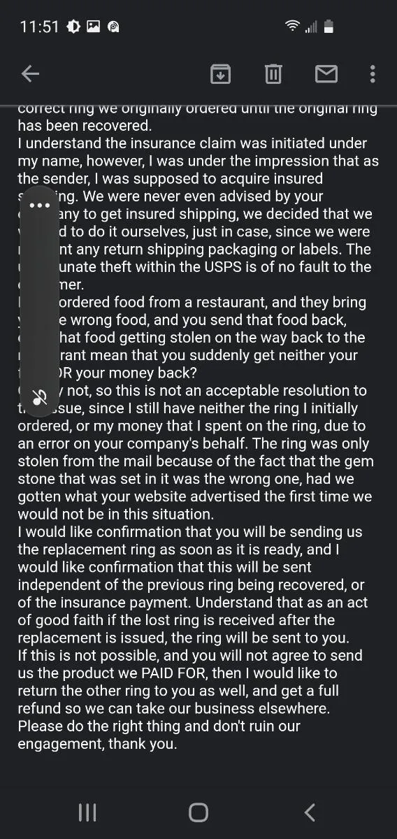 I seems to me, my complaint wasn't read because the issues weren't addressedThere were multiple things wrong with the ring I purchased and the head of manufacturing only offered to repair thing, he offered to have the dark spot on the side of the ring polishedHe didn't offer to repair the damaged prongs, the dent in the ring, the stone that is out of its place, or the stone that is raised above the others and not "below the surface" like the ring designIf they tried everything to make me fully satisfied why didn't they try to fix all the problems with the ring? I would have loved this ring if it were made correctly, it's not personal preference to have a ring made correctlyIf this exact ring were to be purchased from another jewelry company it would be perfect to the naked eye, but this ring has a lot of flawsI don't want to keep the ring because they won't fix it*** offered to allow me to return the ring with no restocking fee since the ring was damaged, his word is no goodAfter my first complaint I emailed the customer service lady, Judy, to ask about my refund and I never received a response from her.Would you buy this ring for a wife, sister, or daughter and be proud of your purchase? ***, ask yourself thatPlease have *** and *** ask themselves that too. Thank you,*** ***