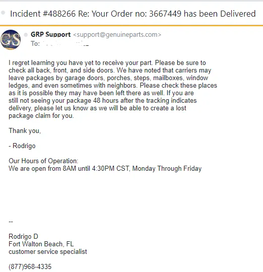 Great customer service, provided by Michael. Helpful, efficient, ensured I had the correct part. He was without a doubt the best customer service representative I have ever dealt with. Actually a delight and fun to talk with. Great job GRP with hiring him.
