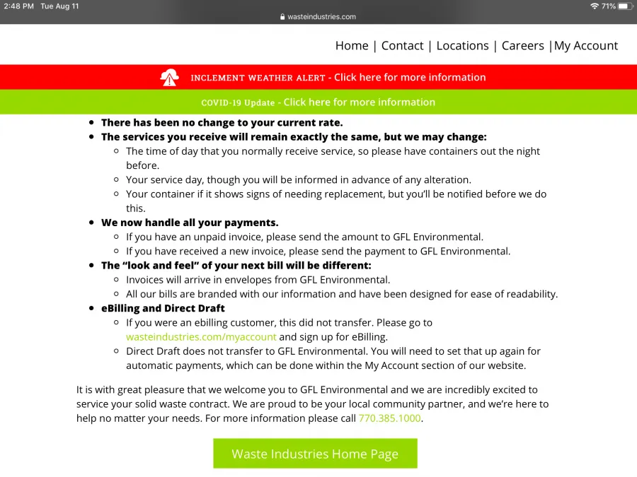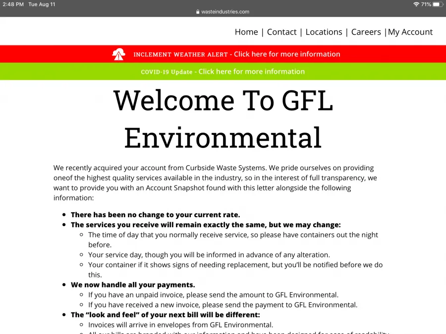 However, they recently stopped picking up both cans. Customer service stated that they have me down for only 1 can and if I want 2 cans picked up I will have to pay more. In one email, the customer service person suggested that I am using a can that was already here when I moved in. This is a lie. The cans are exactly the same and both have Curbside (the company they bought out) printed on them. I offered to send pics of the two cans. Bottom line: to tell me my service will not change in writing, then change it and then accuse me of dishonesty regarding my second trash can is a sign of a company that should be avoided. GFL is, in my opinion, dishonest. Get yoir service elsewhere.