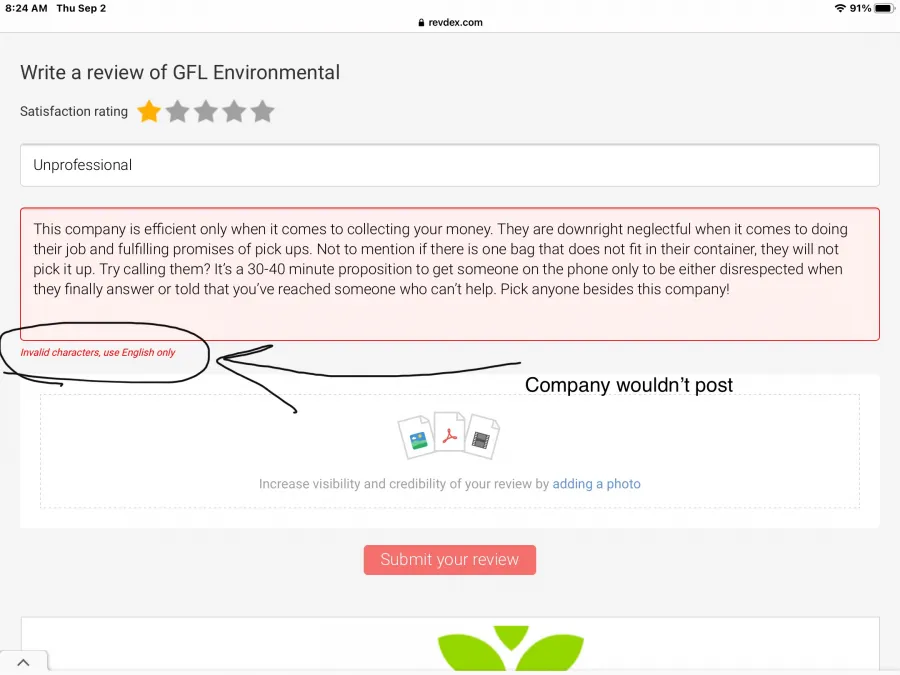 Trash Collection Not Being Made by GFL. All attempts at contact by phone or online have failed. Company has taken full payment and not provided services.