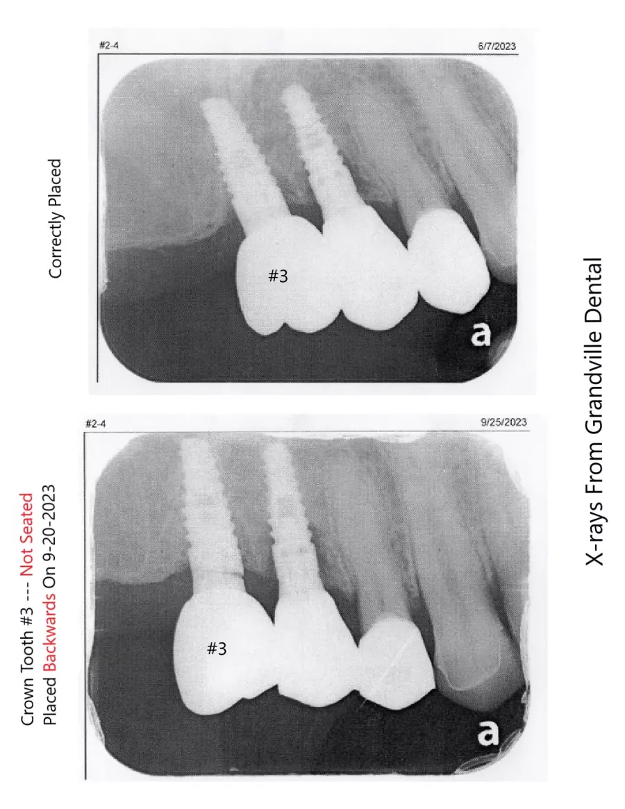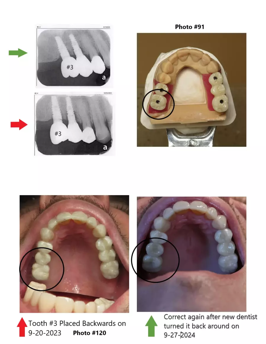 How did a implant supported crown get placed 180 degrees backwards then get missed then several adjustments to the adjacent teeth were made on four different separate occasions until there was no bite on 8 teeth. Permanent adjustments were made to teeth #5, #6, #7, #26, #27 and #28 all based on a crown tooth number 3 being placed backwards and then let me go with a non-functioning bite.