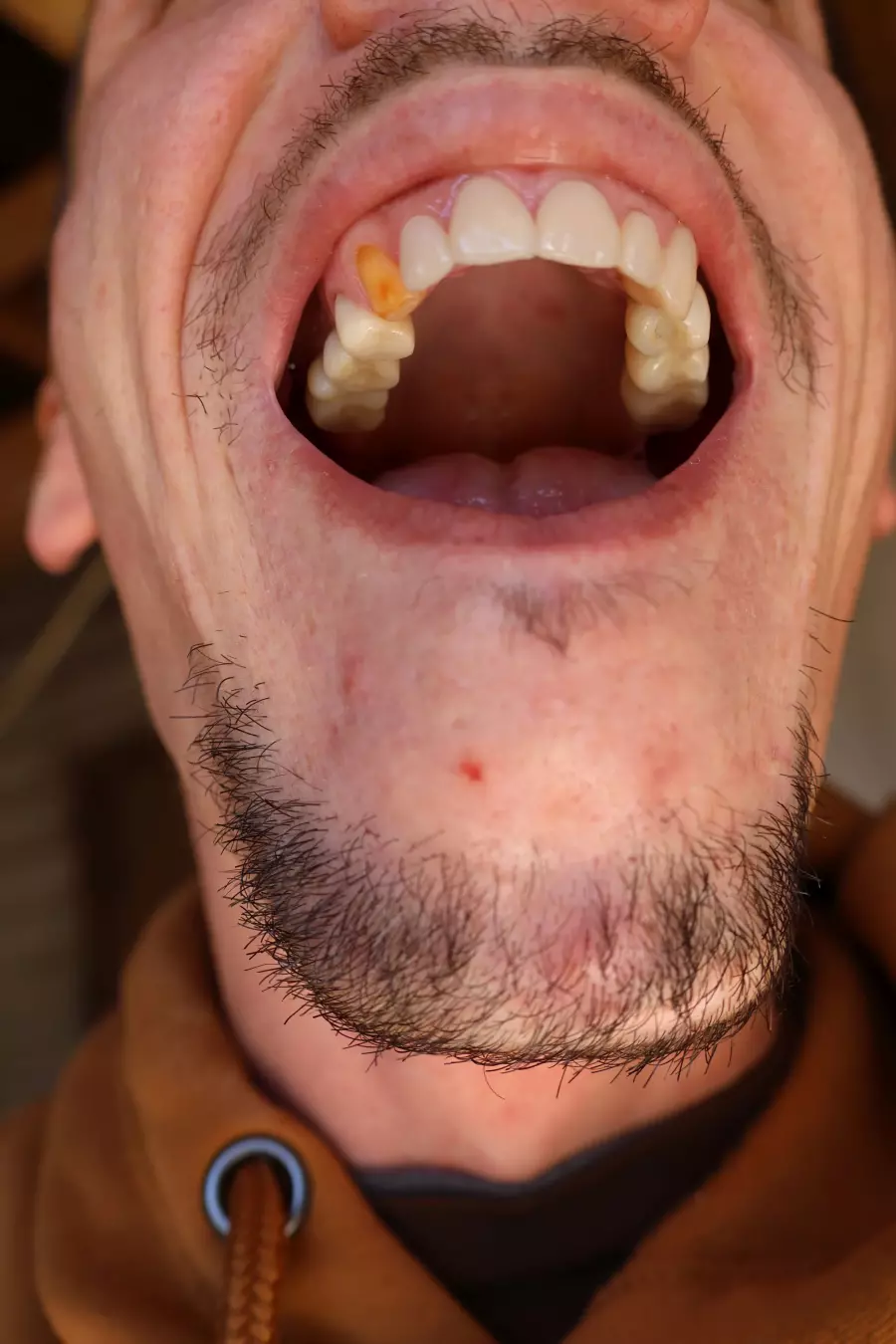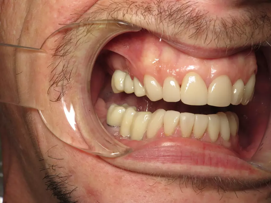 A Bridge became loose, A veneer chipped, A crown fell off, another crown became loose, 8 teeth are not touching each other and I have bone loss on several new implants caused from this.