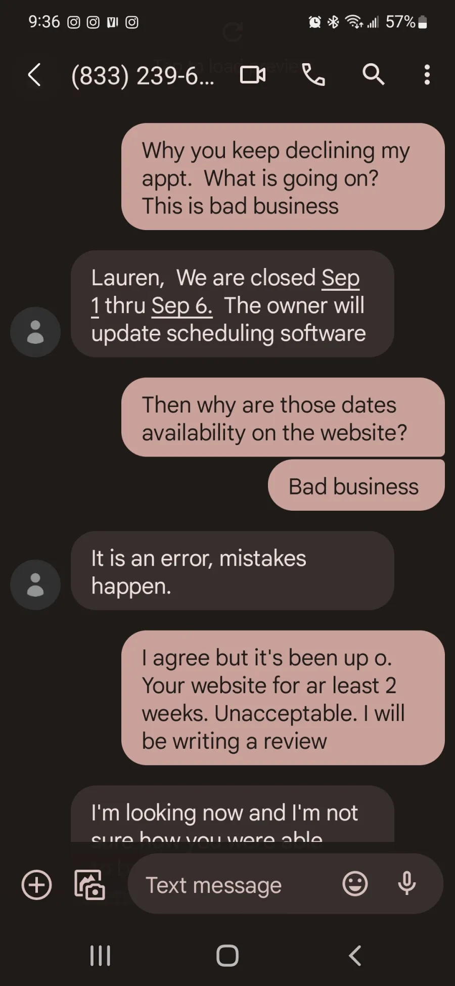 The owner proceded to send me several angry emails accusing me of bullying their business for simply voicing my displeasure with how an appointment I made for my mother was canceled with less than a 24 hour notice, and without any explanation.