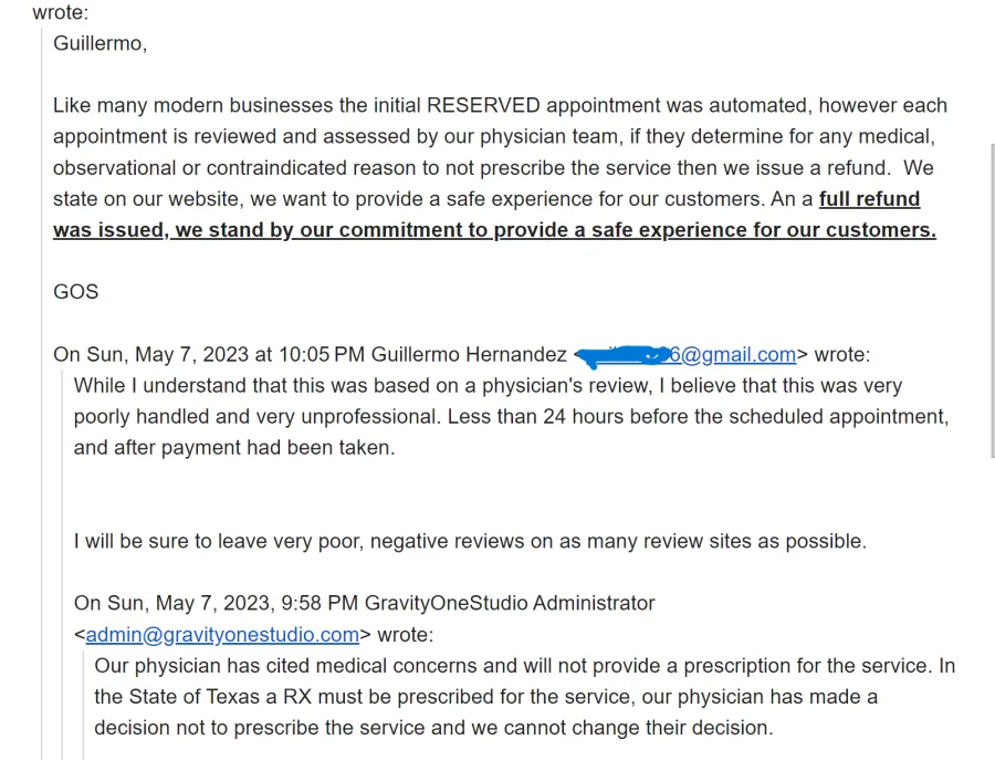 After the reply stated it was due to their physician not approving the RX, I said I understood that reasoning. I explained in the email that what I took issue with was the appointment being canceled with such a short notice (10pm the night before) and no explanation as to why. I shared my thoughts on how I considered it unprofessional to wait until the night before the appointment to cancel. This was after the appointment had been already set for three days. And payment of over $130 had been made.