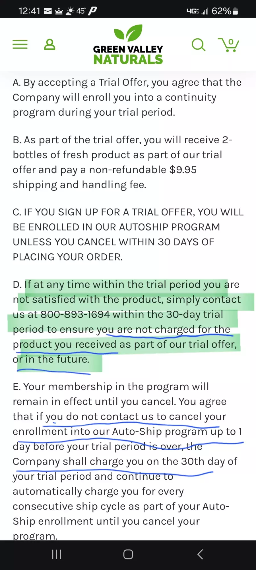 Green Valley Natural Solutions is a scam. Now I am afraid to even try the product afraid it is a scam too. You have 30 days from the date the order was placed to return the intact full bottles back to the company, or you will be charged the full $199.00. So the 90 day satisfaction guarantee does not really exist. BEWARE DON'T ORDER FROM THIS COMPANY IT IS A SCAM