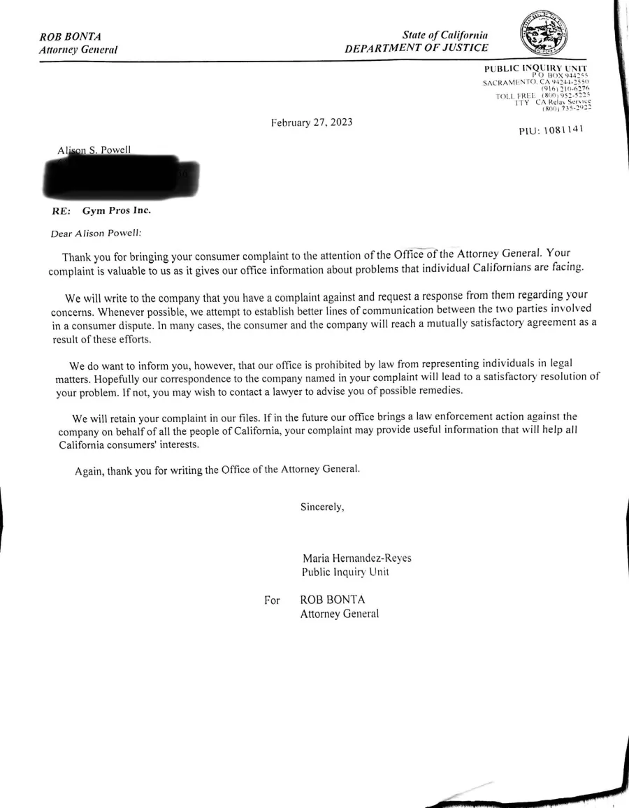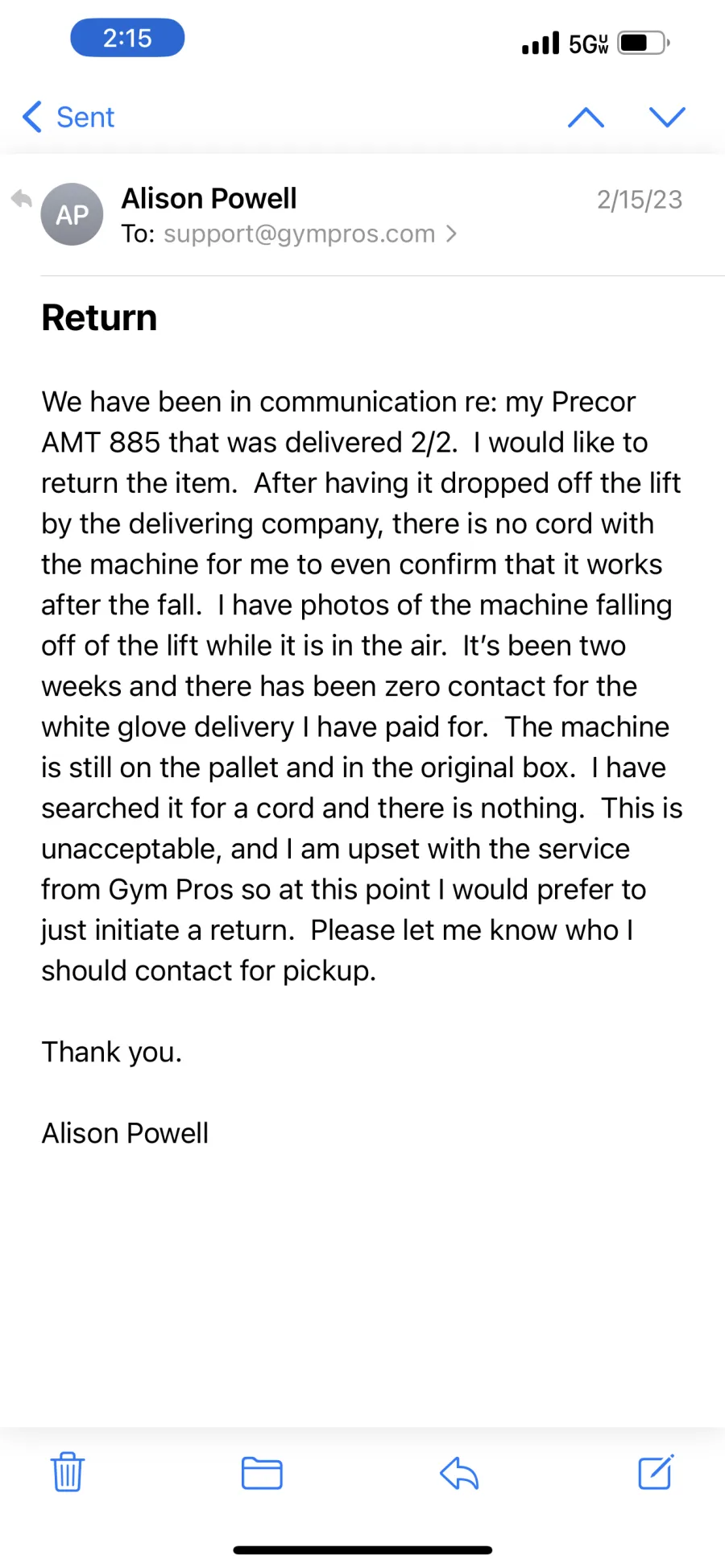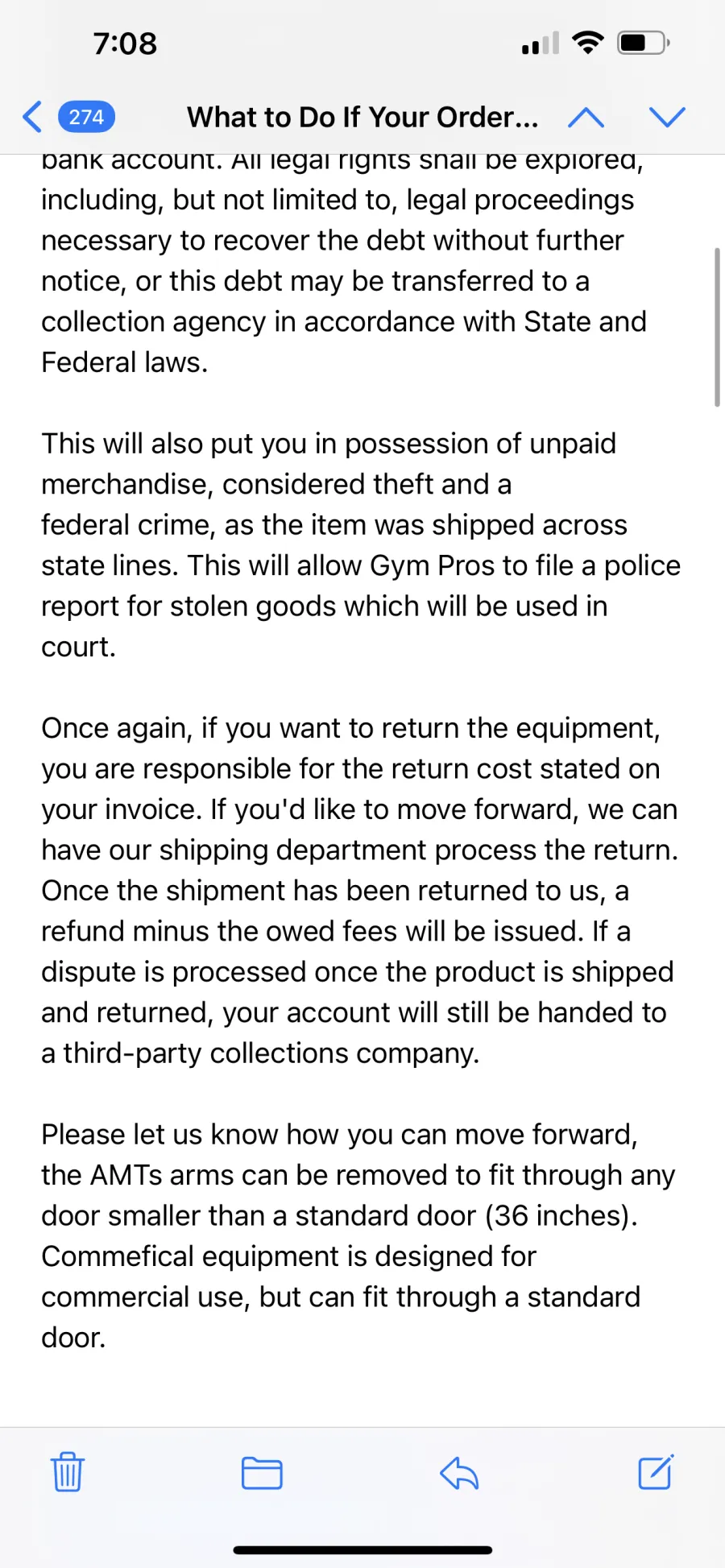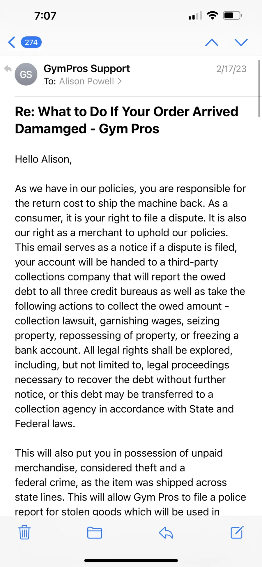 The company claims to be certified by the Better Business Bureau, however, upon, visiting that site to file a complaint, I discovered this is falsely advertised information. They, in fact, have an F rating. I urge you to reach out to the Attorney General and Consumer Protection Agency for the state in which you live and also these departments in California where Gym Pros is located. Both were very receptive, and per their responses, made it sound like this company would be investigated further if they continue to receive more complaints. I reported false advertising by a company and inaccurate descriptions on their website. I also reported them for not fulfilling the original order as it is now March 22, 2023 and I still have not received the mat, the white glove delivery, or even a complete power cable for the AMT 885. I requested to return the machine on February 15 and threatened to dispute the credit card charge if I didn’t get a reply. No reply. I did file a dispute with my credit card company, and after I filed that dispute I received a threatening email from [email protected] which read “This email serves as a notice if a dispute is filed, your account will be handed to a third-party collections company”. The owner of Gym Pros threatened a “collection lawsuit, garnishing wages, seizing property, repossessing of the property, or freezing a bank account.” He also said “This will also put you in possession of unpaid merchandise, considered theft and a federal crime… This will allow Gym Pros to file a police report for stolen goods.” The company quit responding to my emails with request for help regarding the missing mat, power cord, and white glove delivery. Half of a power cord did show up on my door step one day that I believe to be from Gym Pros as it had their name on the invoice. It also had the name Roy Crocker who I believe to be the person that has responded to my emails which have remained signatureless despite me asking for a name multiple times. After the dispute was over, they have refused to send me an RMA to send the machine back stating that I’m outside the 30 day window despite the fact that I requested the return within 30 days. They are again ignoring my emails.