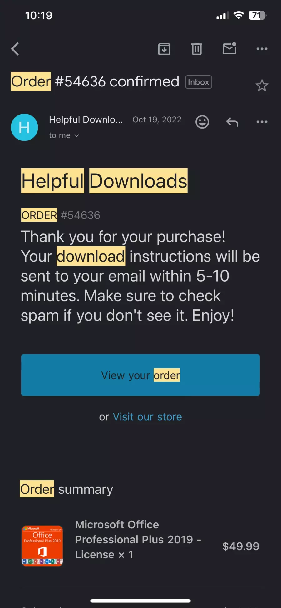 On August 6, 2020 I purchased a download of Microsoft Office 2019 for the sum of $39.97. I received instructions for the download, however they did not work. I emailed this merchant on the 6th and received no response. I emailed again on the 7th and was told to provide a phone number and someone would call immediately to assist. I have not received a phone call or email from this merchant. I have emailed several times asking for a refund and yet again, no response. I have since found an address and Googled said address to find that it is a UPS store front.