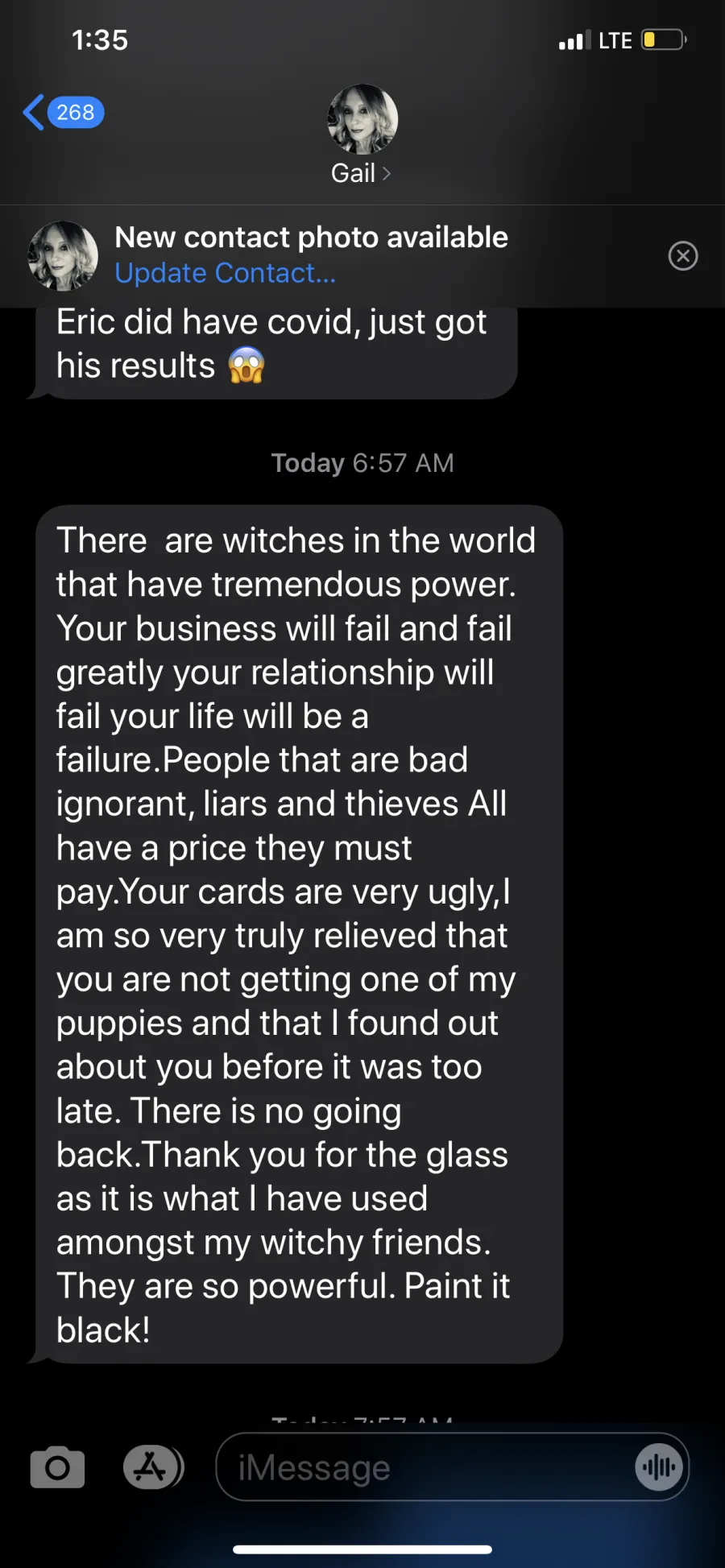 When telling her I was canceling my check (she had not yet cashed), I was threatened repeatedly with the idea of witchcraft including using my handmade pint glass as an idol for her witches to cast spells on me.