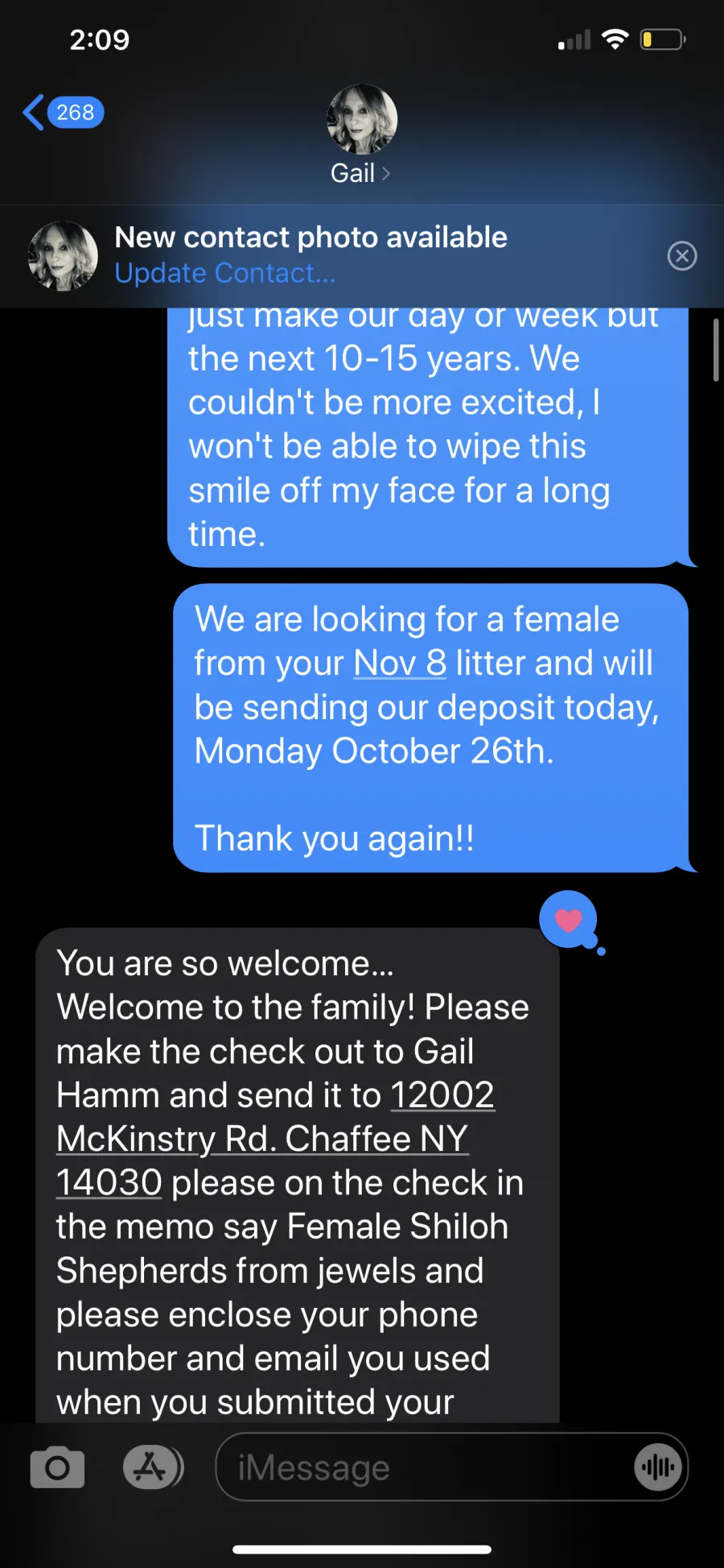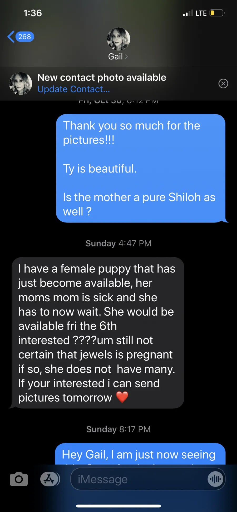 This woman sends pictures/videos of her dogs stating she’s the most sought out Shiloh breeder in all US. Well thank goodness I hadn’t sent my deposit! She will keep you hanging and won’t answer your texts or phone calls!