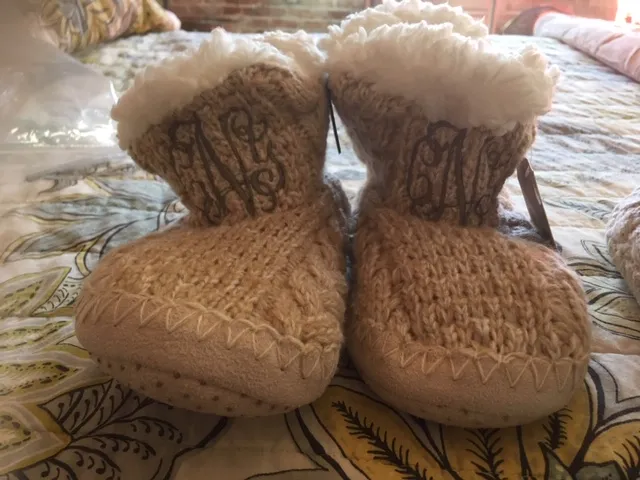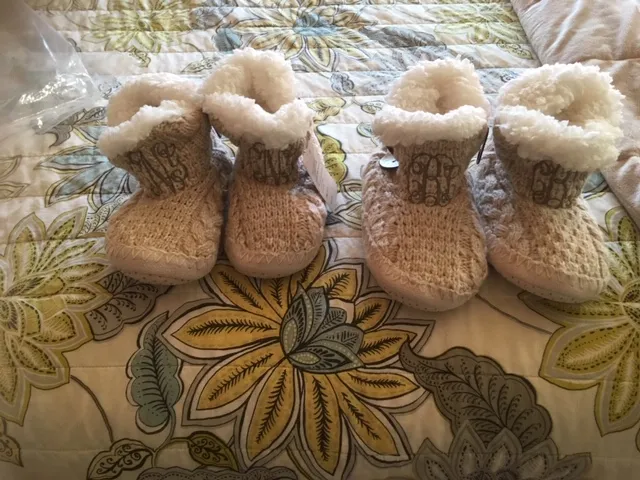 I received four pairs of monogrammed slippers the day before Christmas. All four were the wrong color. The monogramming was so bad that I couldn't tell what the letters were on all four pair. It's looks like the mongram machine was off stitch. These were xmas gifts that I was too embarrassed to even give as gifts. The sizes were all not true to size and all four pair were grossly too small. I've sent three emails and have received no response. The customer service number might as well be disconnected because it answers and then hangs up on you cause no one answers. Never make a purchase with this company. You're stuck with whatever crap they send you and I'm out almost $100.
