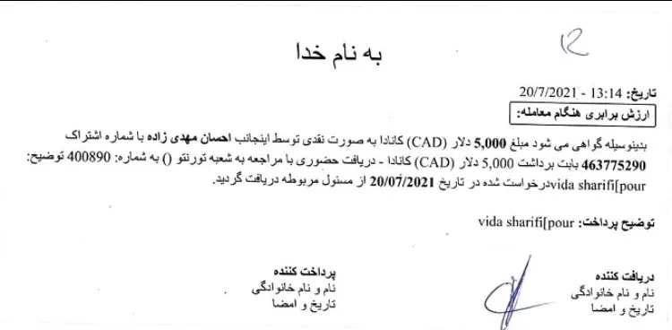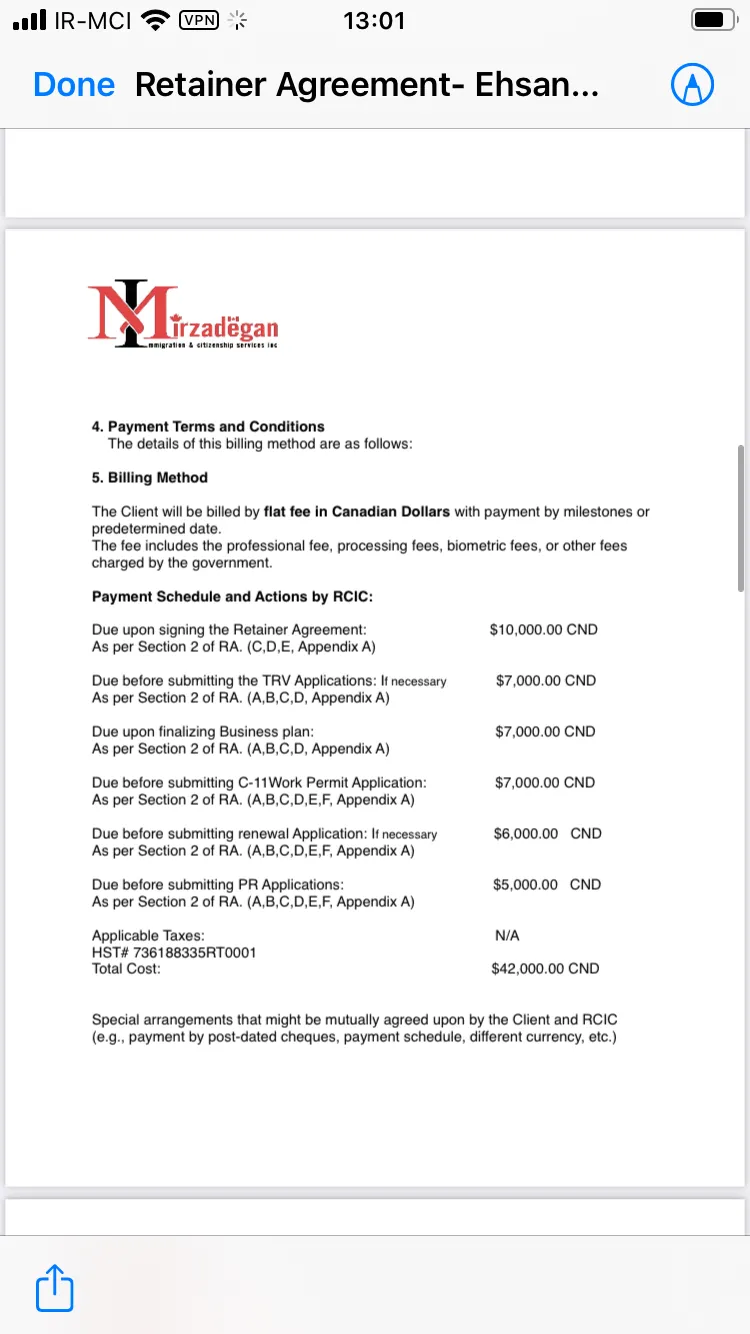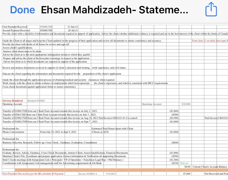 Important Note: He did not include the tax amount in the contract, and the amount of $ 42,000 for the attorney's fee seems unreasonable, and the non-inclusion of Mr. Phil Mooney's second lawyer's signature and the unofficial bill regarding the restaurant's income compel me to do all this. Has I stopped my immigration case and pursued it? Do I, who intend to immigrate to Canada as an immigrant and start living from the beginning, have these official figures or not? His tax should be carefully examined from the beginning of the issuance of the business license, and that my amount with all the expenses I made for this contract is the amount of $ 20,000 that they should deposit in my account the losses that I have incurred.