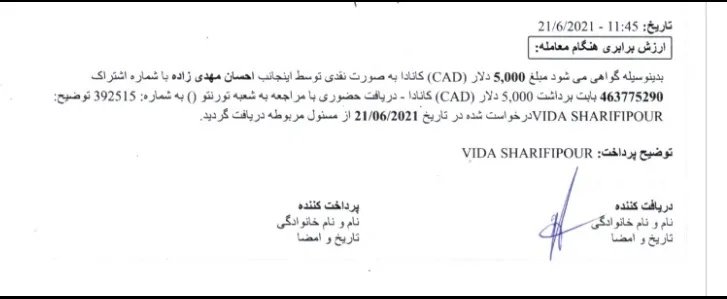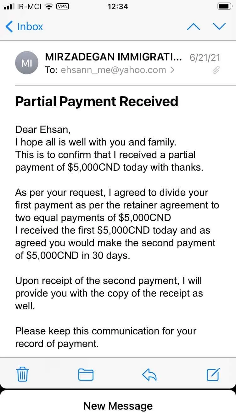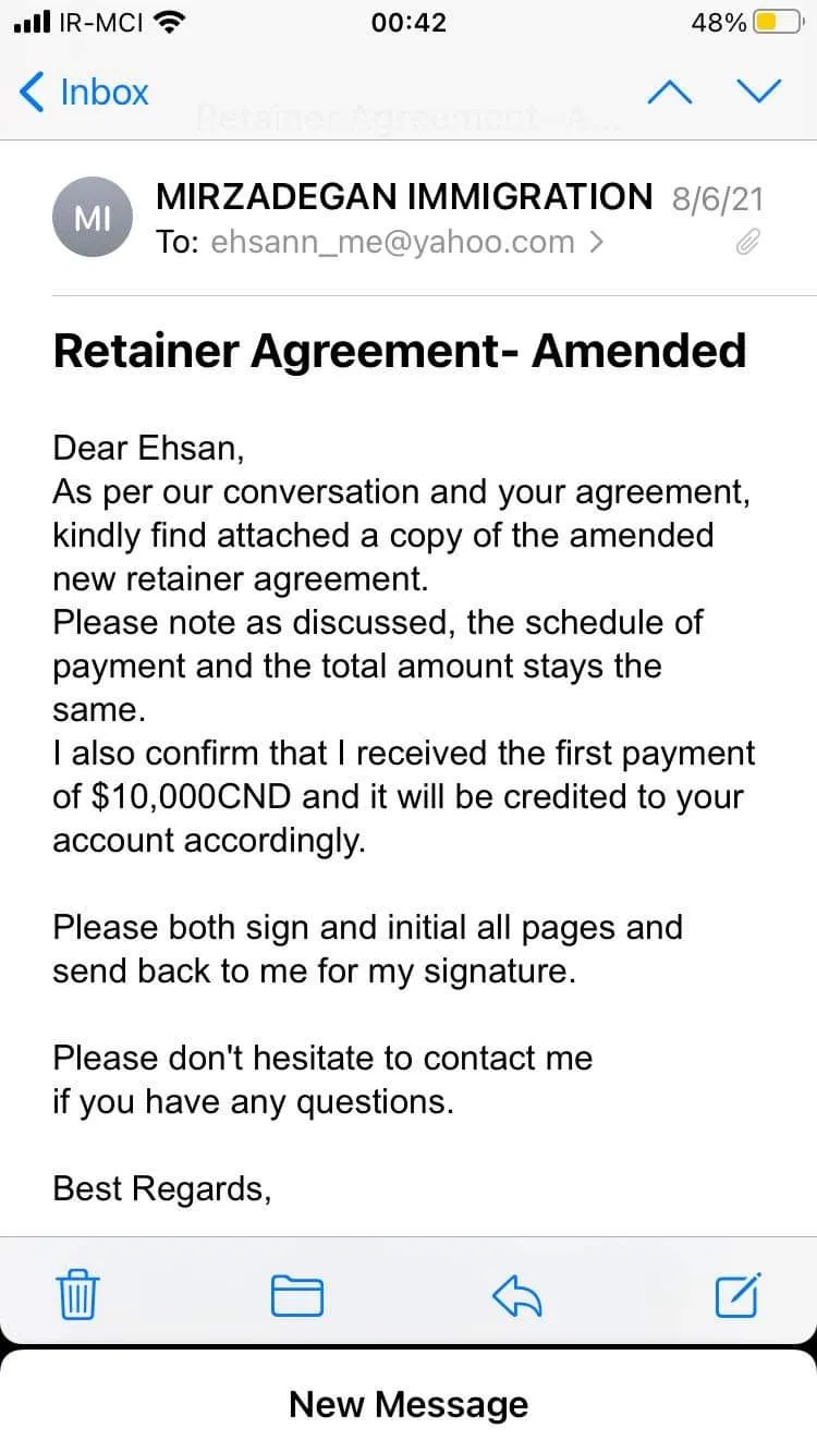 At the moment, Ramin Mirzadegan is saying that the $ 10,000 I deposited so far has been a contract, and Ramin cites this. I did, file, folder and scan regularly for Ramin. He just turned on the computer and opened his email and received my documents in a file. Do I have to pay Ramin $ 10,000 in damages for this? On my behalf, this contract has not been terminated and canceled. I have not signed a contract, I have not paid to want to terminate it. I decided to emigrate. In addition to the $ 10,000 I owed to Ramin Mirzadegan, I also owed $ 10,000 for the same contract, at Ramin's request, such as an official bachelor of real estate, translating about 500 pages of a translator's signature, matching qualifications for WES Canada, The cost of scanning, filing, folding and other costs حال being At present, I owe $ 20,000 to my creditor Ramin. In addition, I have to calculate all the damages for the delay of the money and the profit of the losses and damages that he has caused to me and my family, up to one dollar, with such swindlers who are my Iranian compatriots. My request to the Ontario Canada Immigration Advisers is to receive $ 20,000 and its loss profit to date, and the most severe punishment for revoking the immigration license of Ramin Mirzadegan and Phil Mooney, to be dealt with decisively. I even request the revocation of Ramin citizenship. They should not live in a country like Canada, which is very legal.